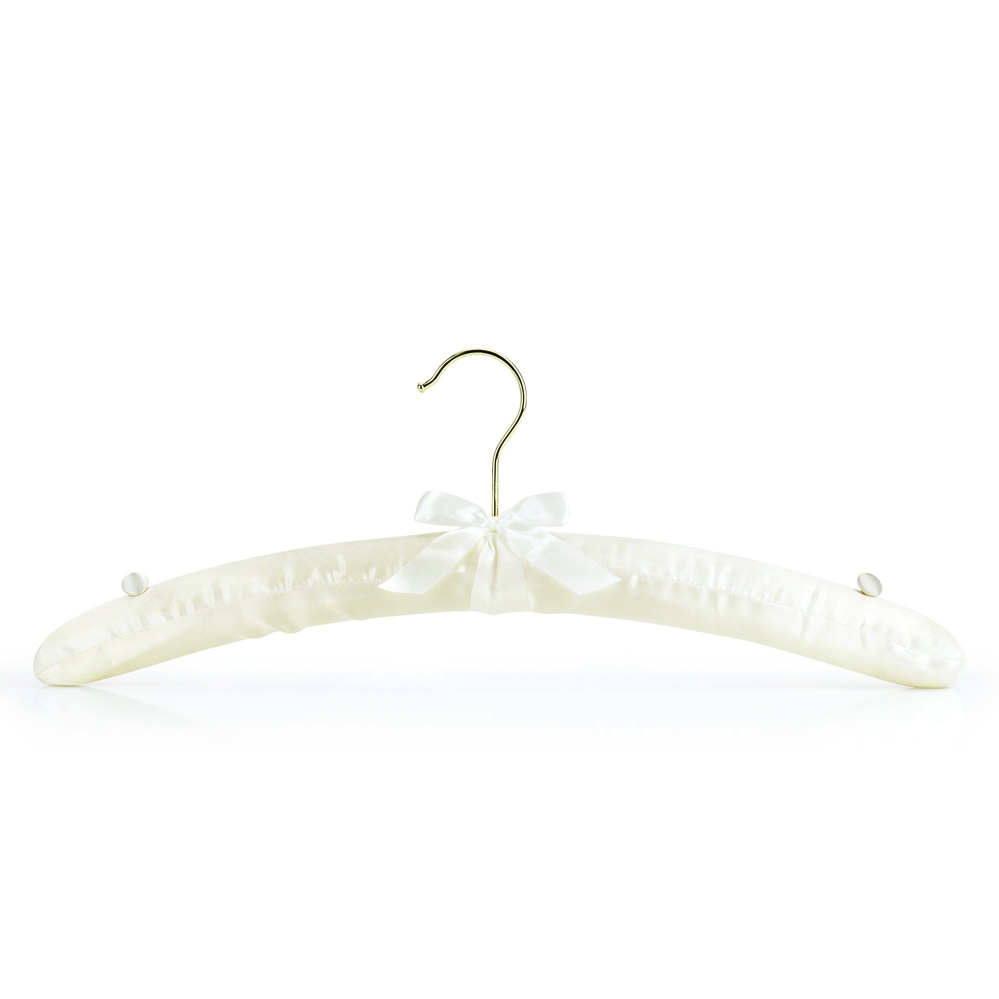 Premium padded hangers for women clothing. elegant design with silky soft satin fabric, gold color hook and bow means this is a perfect bridal hanger and will complement any wedding dress. Stuffed with cushioning, these no bump hangers are gentle on delicate garments and will not wrinkle your clothes. you will never have to worry about your garments falling to the floor and getting dirty, as gentle folds in the satin on the hanger will hold your clothes securely. The inner frame of the hanger is made from solid wood with a strong hook, which means these hangers are robust and you can hang large clothes without worrying about the hanger breaking.This bridal hanger is popular with high-end bridal boutiques and wedding dress stores. supplied by a trusted British brand, this classy hanger is designed to be the perfect companion for your wedding dress.
