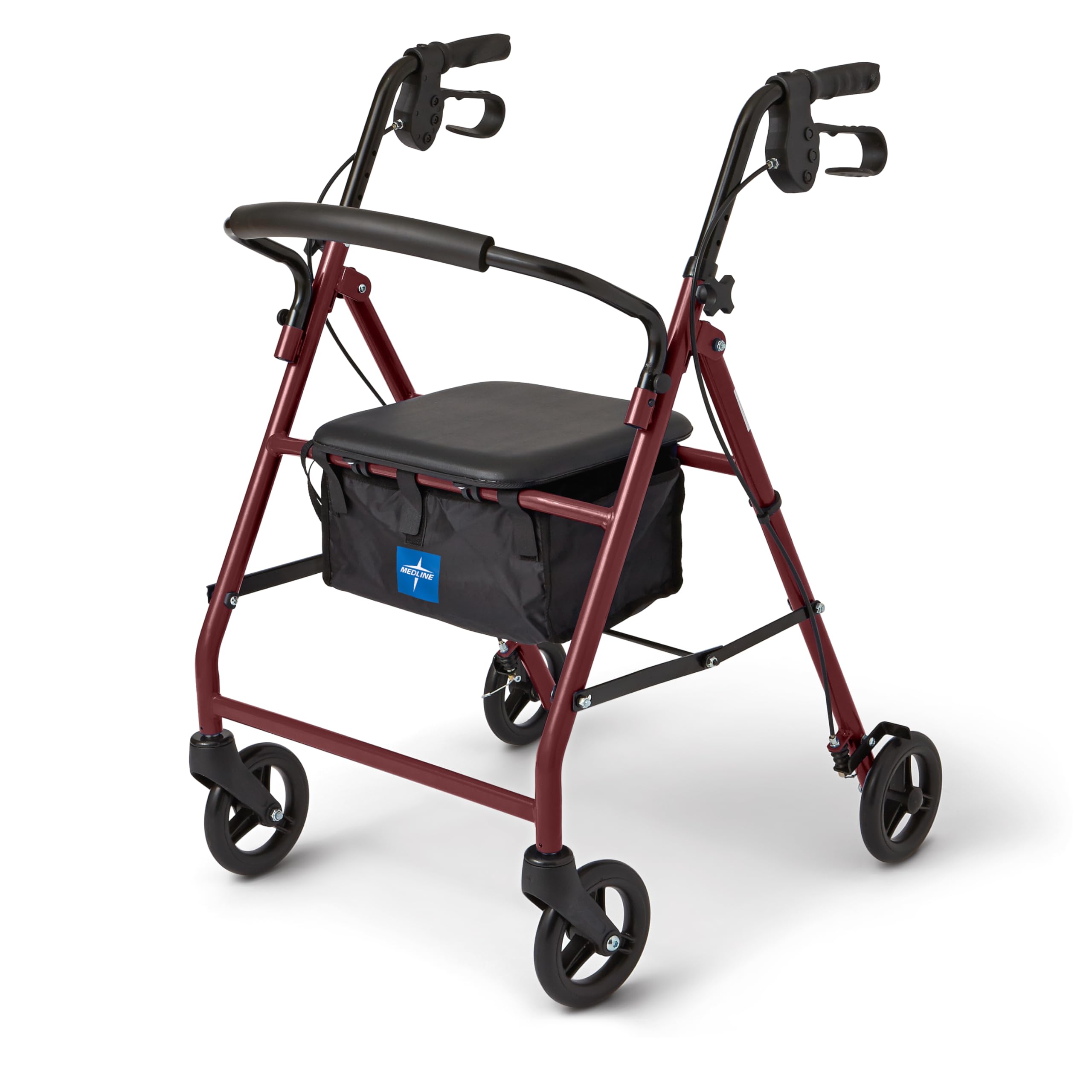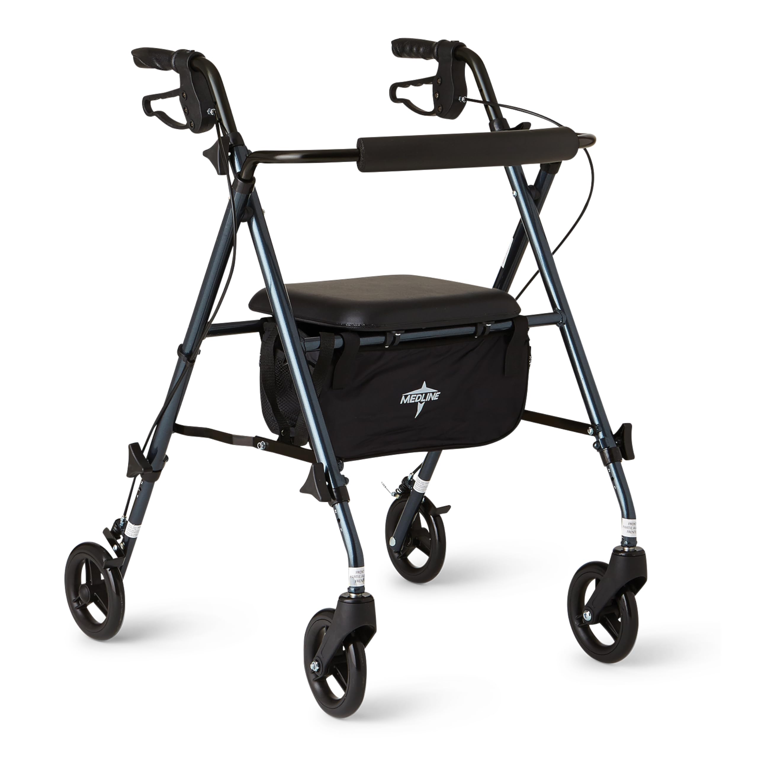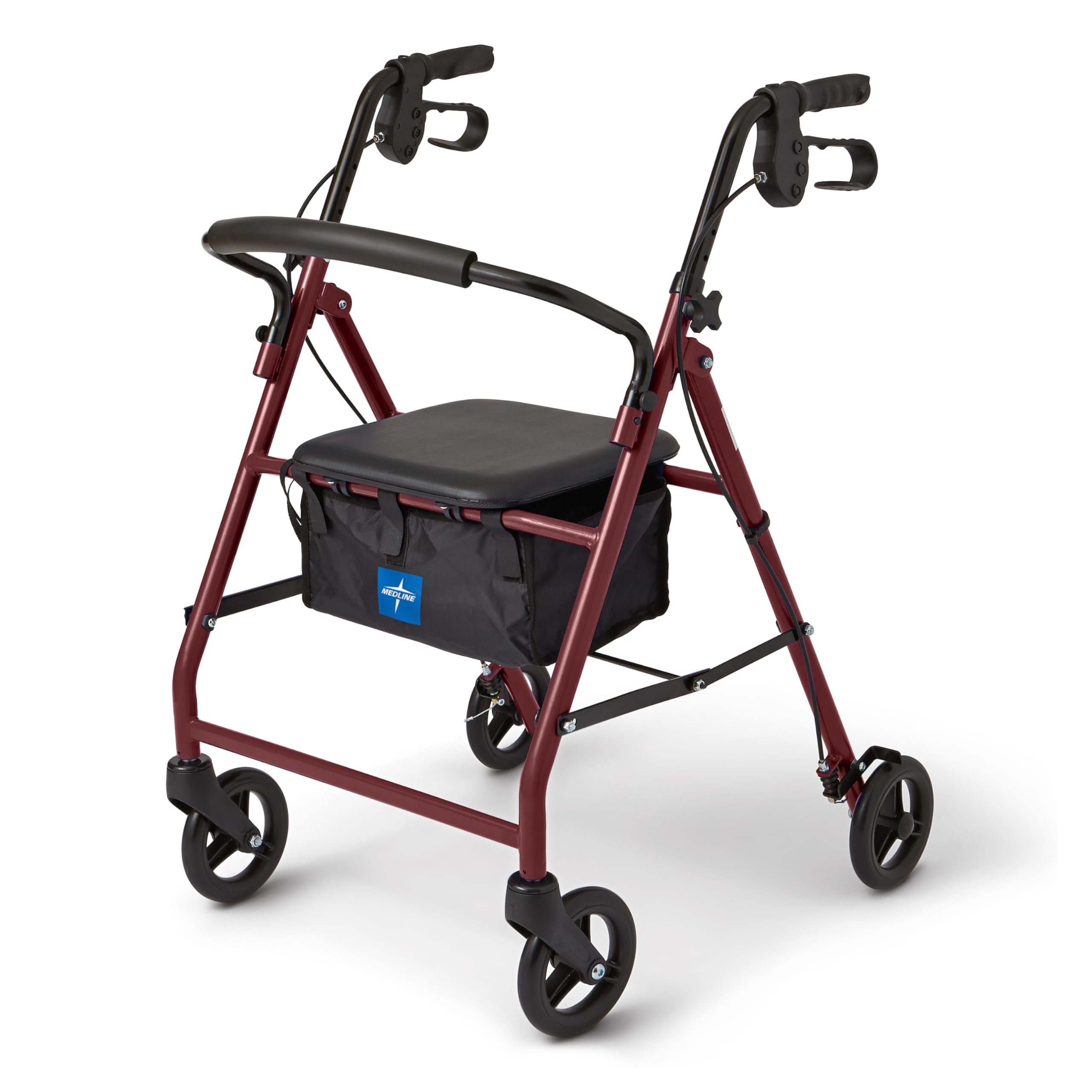 Trusted by healthcare workers and hospitals everywhere, Medline’s premium Empower rollator walker is equipped with multiple features to support seniors, adults and elderly, and those who have mobility impairments. Empower comes standard with large 8" wheels to easily move from indoors to outdoors smoother than ever before. Features oversized 16x14" black memory foam seat that adjusts 20.5-24.5". The seat also flips up for better stability and accessibility. The black aluminum durable frame weighs just 23 lbs. but supports individuals up to to 300 lbs. This walker is great for adults and seniors and those with limited movement ability, seeking more stability. Fit with spacious under bag storage, Empower transports you and your essentials safely and conveniently. To engage brakes, simply squeeze the easy-grip handles. To keep wheels in a safe, locked position, push grip handles to the down position. This prevents the rollator from moving when standing still, sitting down or standing up. Effortlessly customize your walker by flipping up the backrest for more room, or adjust the height of the handles to your perfect fit.