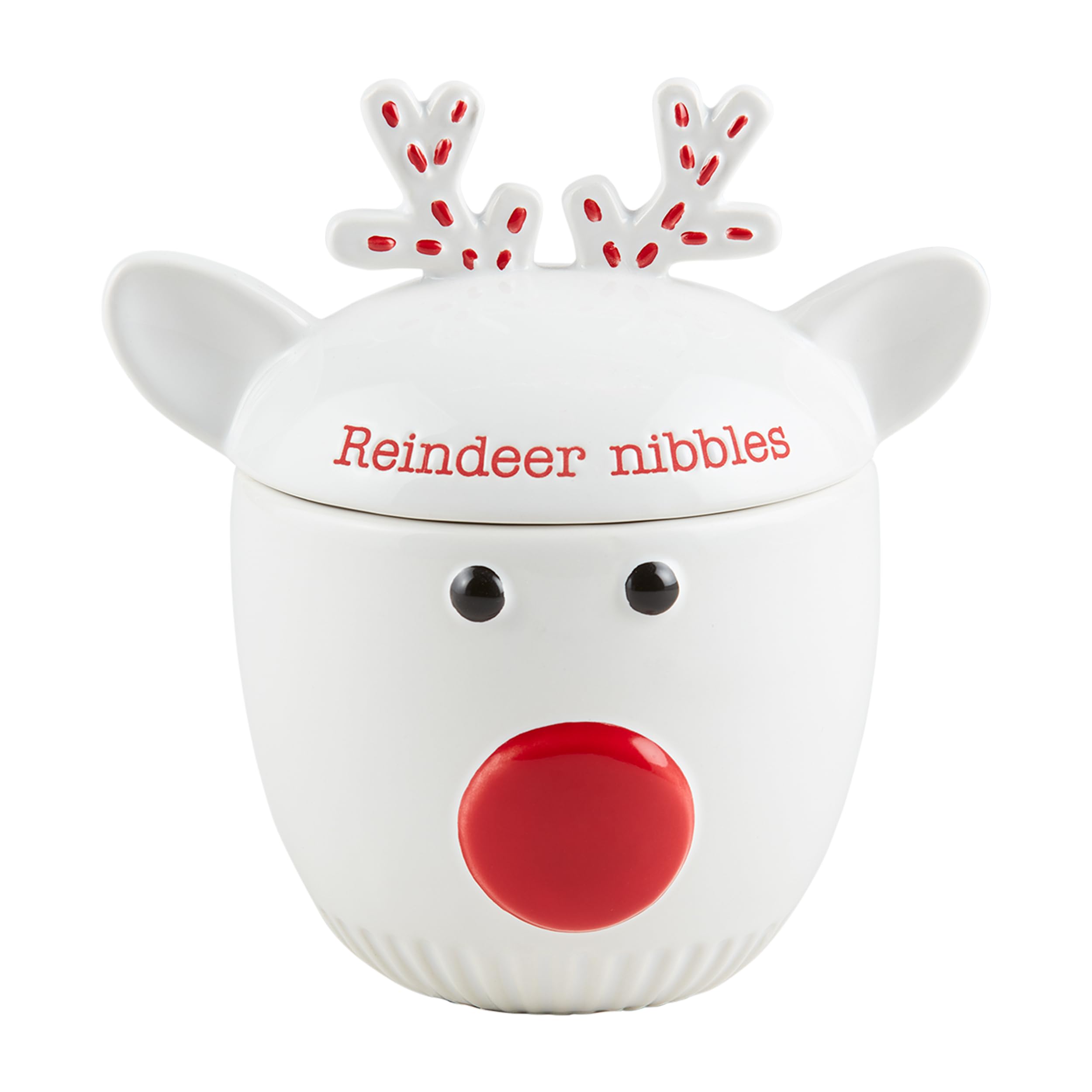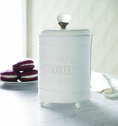Footed ceramic container from Mud Pie features detailed "COOKIES" embossing and vintage-style glass door knob handle on lid.