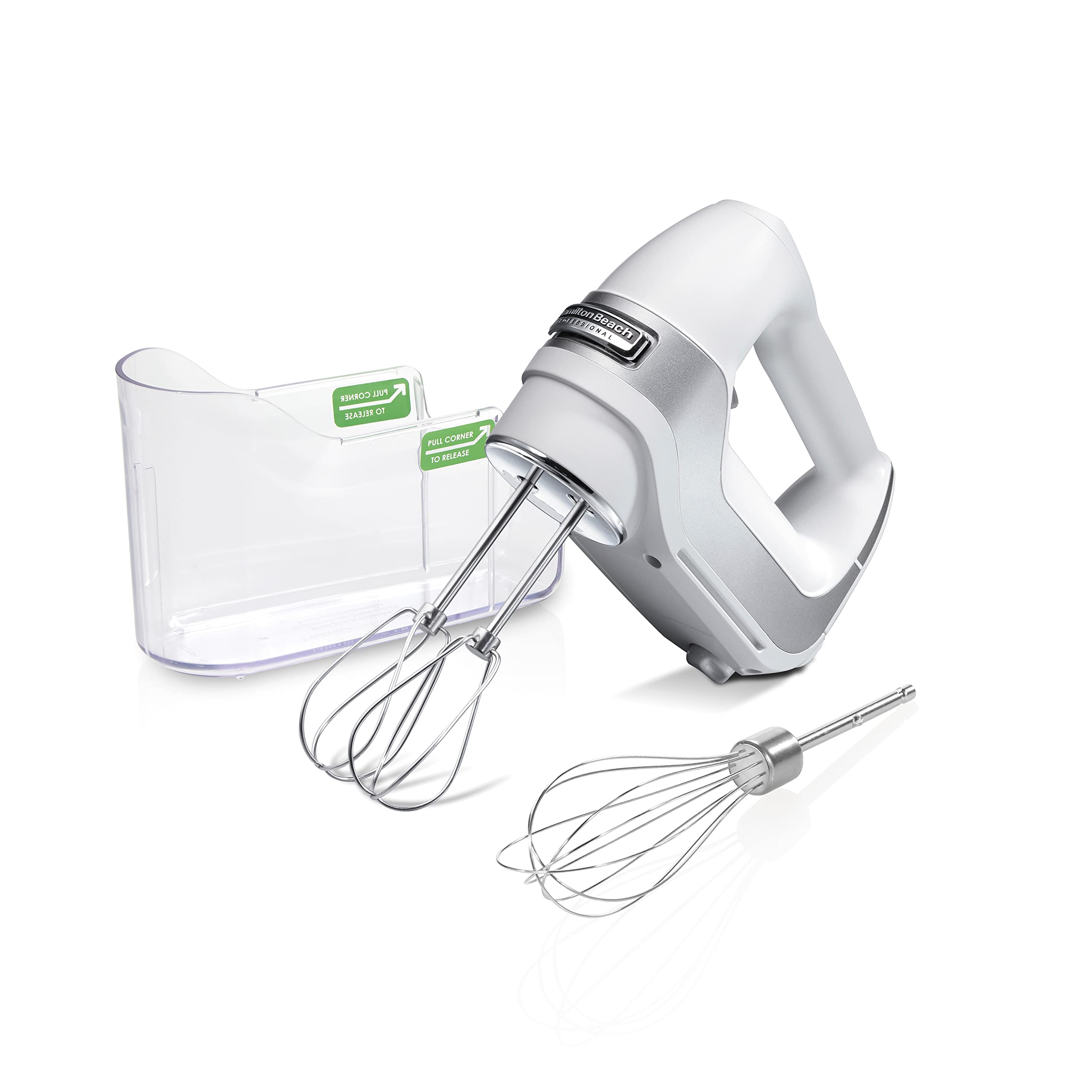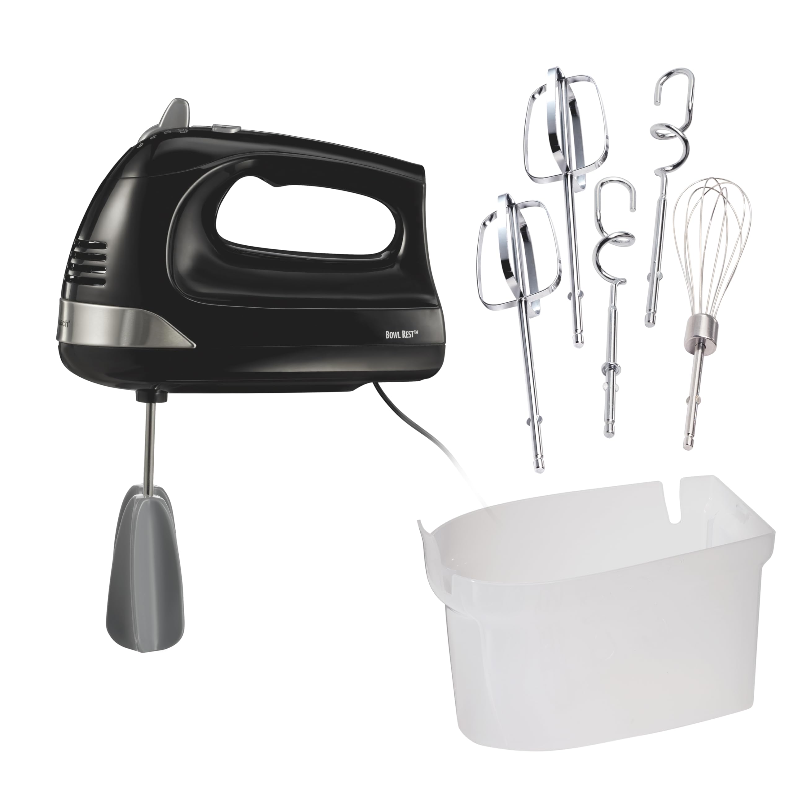 - INCLUDES COMPLETE 3 PIECE ATTACHMENT SET: The Hamilton Beach hand mixer includes everything you need to start mixing. It comes with 2 dishwasher safe traditional beaters and a whisk. All the accessories store neatly in the snap-on storage case