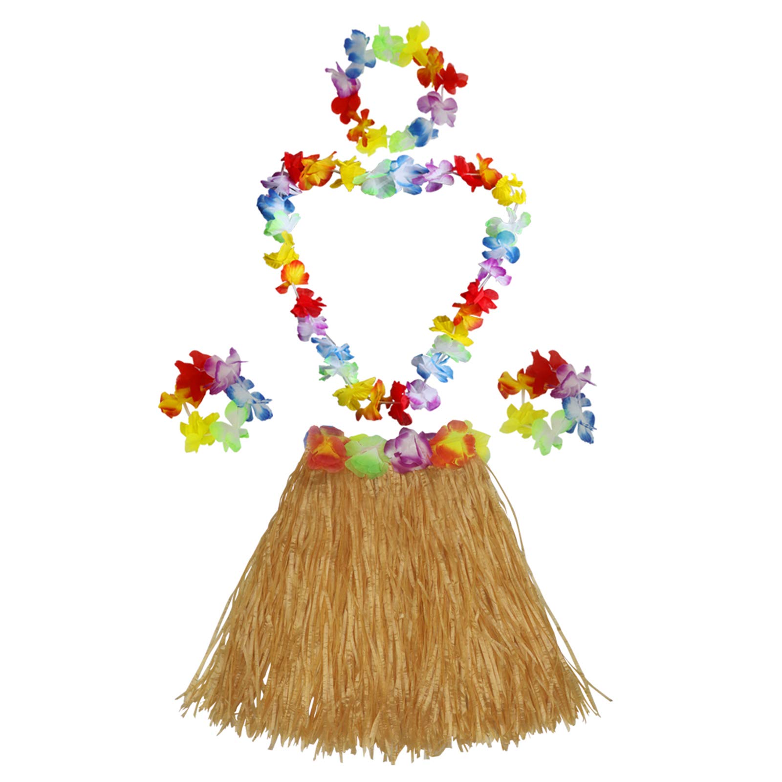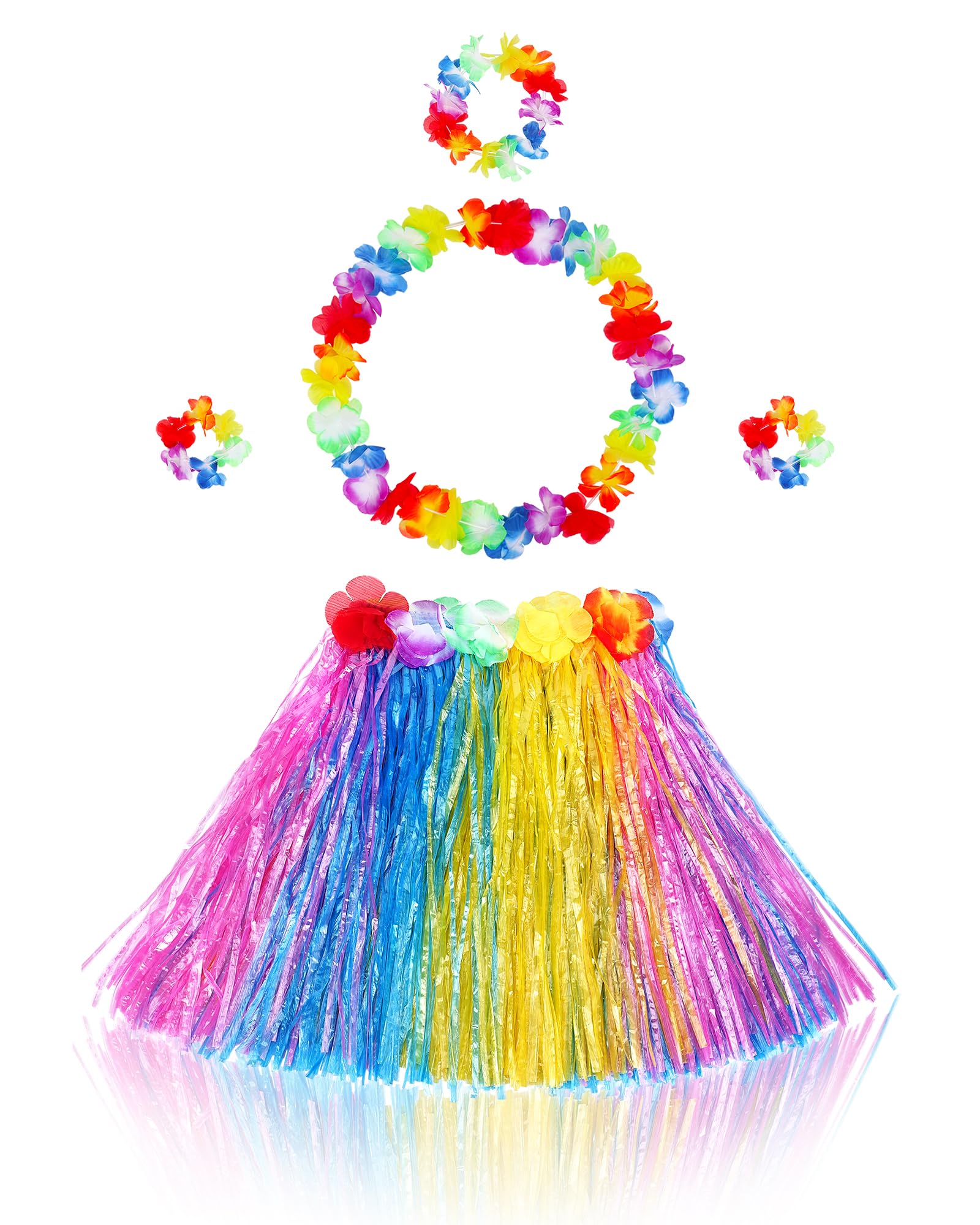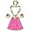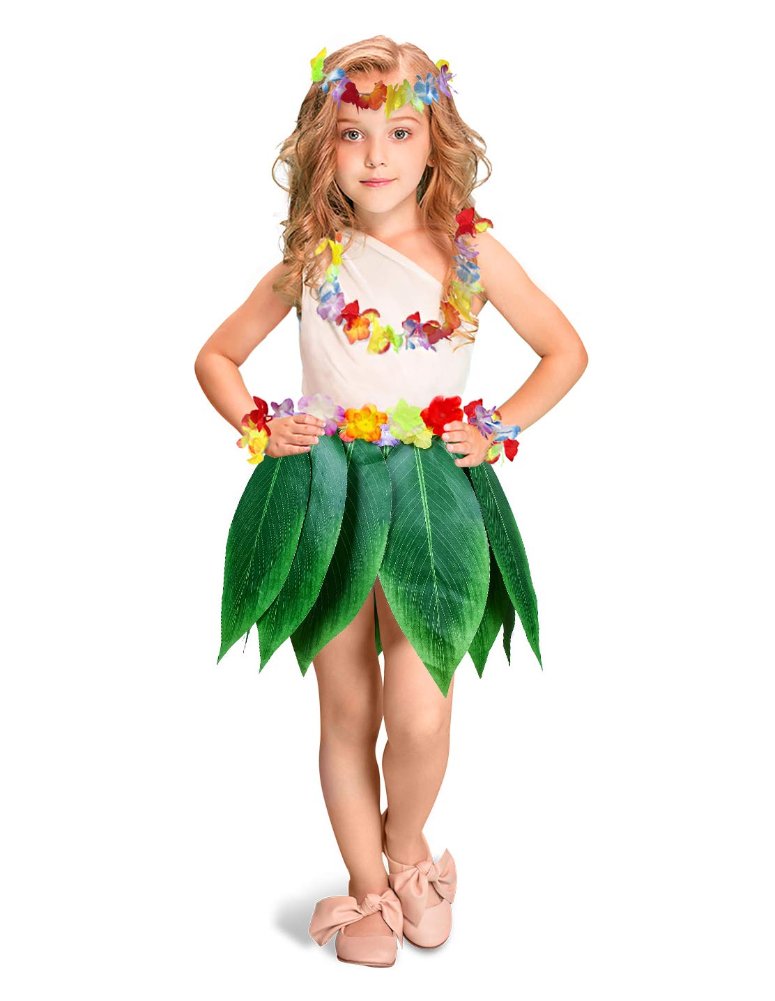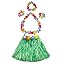 Girl's Elastic Hawaiian Hula Dancer Grass Skirt with Flower Costume Set-Green 13 Years