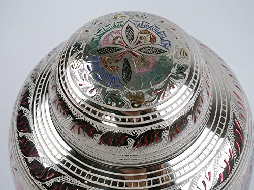 Liliane Memorials Brass Cremation Urns Florale funeral urn in Silver Funeral urn is handcrafted of 100% brass and finished in nickel with an intricate hand engraved motif. The urn is decorated with a colorful flower etching by experienced artisans in India. Time-honored design offers an elegant resting place for your loved one. Attractive urn will fit well with any decor, particularly on a mantel over a fireplace or in a library. The Florale Urn evokes the memory of your loved one in a traditional and colorful design. About Liliane Memorial Urns Our handcrafting process results in slight variations in color or finish, making each urn a unique work of art. Our urns offer a threaded lid that allows you to safely and securely handle or transport the urn. A felt-lined bottom is standard on all of our urns to protect your fine furniture. Liliane Memorials urns are maintenance free; simply wipe the hand-made brass urn with a clean dry cloth. All of our urns are wrapped in an plush cotton bag and securely packed in a box. All of our adult-size urns have a capacity of at least 200 cubic inches, and fit the remains of adults weighing up to 200 lbs. 100% Satisfaction Guarantee We trust that you will be happy with the quality and design of our products If you are not happy with the design you selected, please return your unused urn to Amazon for a full credit and select another Liliane Memorial Urn. Unfortunately, given the personal nature of funeral urns we cannot accept returns after you have used the urn.