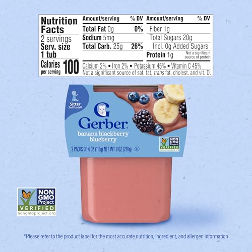 Gerber Stage 2 Baby Food, Banana Blackberry Blueberry Puree Tubs are a premium choice for your child’s early stages. Crafted to help support their nutritional needs, along with meeting the busy lifestyle needs of caretakers and parents. Each baby puree tub comes in a portable, easy-to-store format – making it perfect for life’s busy moments. This stage 2 baby food puree is designed for babies who are 6 months + and are ready to explore new textures and flavors. Gerber understands the importance of providing wholesome ingredients during the crucial developmental stages of your child's life -- that’s why our baby puree is Non-GMO Project Verified. Gerber baby puree is ideal for parents who seek a convenient and high-quality option in their baby's diet. These tubs need to be refrigerated after opening and must be used after 1 day.