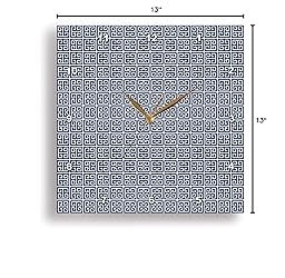 - Blue and white Greek key pattern wall clock is a wonderful complement to any room in your home or office. Made of durable high grade aluminum. This frameless clock has a high gloss mirror like, UV coated, scratch resistant finish and is suitable for a moist environment. Sizes available range from 10x 10to 15x 15. Requires one AA battery; not included. Battery box is not covered.