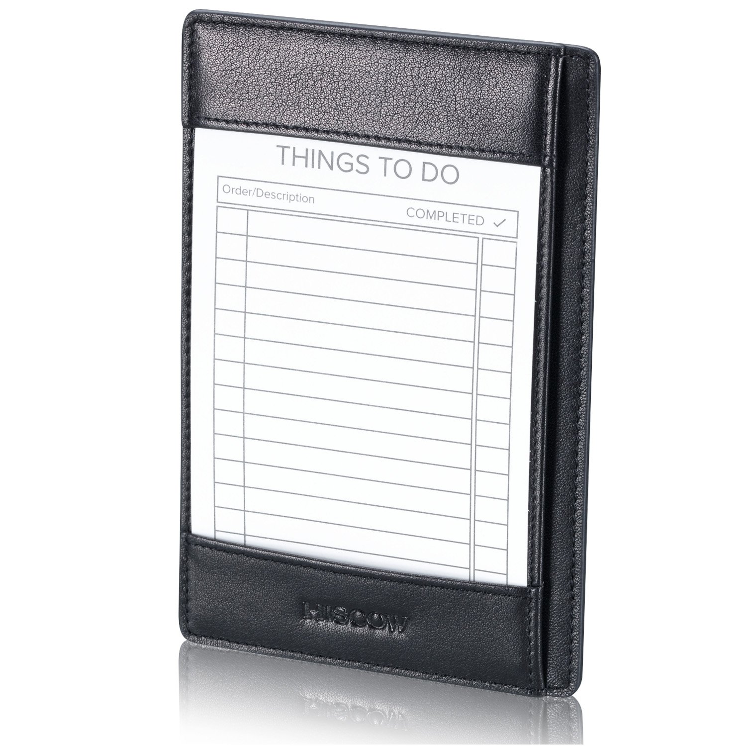 - What You Get: HISCOW thin card holder, in an exact-fitting and classy matte-black box. Welcome guide, our worry-free 12-month warranty and friendly customer service