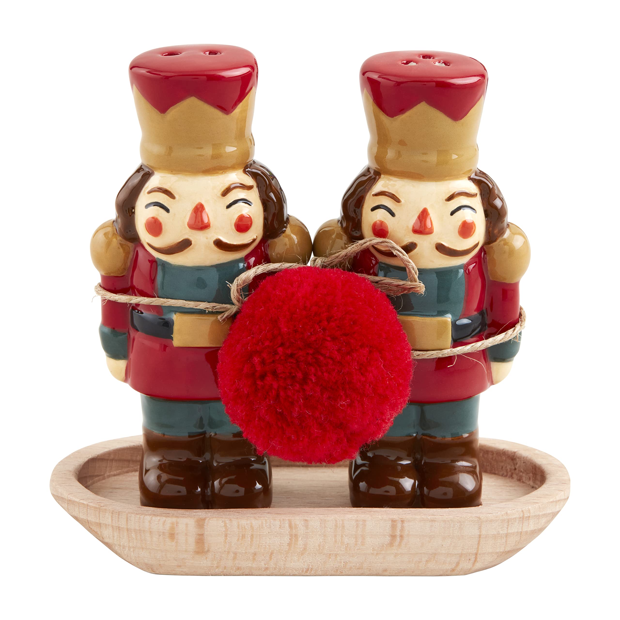 3-piece set. Stacked ceramic salt and pepper cellar set topped with glass door knob features embossed "salt" and "pepper" labels.