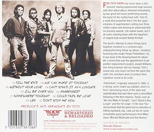 Special Deluxe Collector's Edition / Fully remastered sound shaped from 24 bit digital technology / Toto's Gold selling sixth studio album featuring their current lead vocalist, Joseph Williams / Produced and Arranged by Toto / Includes 'I'll Be Over You' and 'We Can Make It Tonight' & Can't Stand It Any Longer / 16 page full-colour booklet, 3,000 word essays, new band interviews and enhanced artwork. For Toto there has never been a dull moment. Having experienced huge success with their debut album, followed immediately by two great but lesser performing records, the band hit the motherlode with Toto IV , a work that propelled them into the upper echelons of superstardom, selling over three million copies and winning an unprecedented six Grammy awards. Life looked sweet, but it all came crashing down with the departure of original lead vocalist Bobby Kimball. The band's attempt to piece things back together resulted in a commercially underperforming follow up album, Isolation , featuring new singer Fergie Frederiksen. So, it was back to the drawing board for album #6, a record that saw the appointment of yet another replacement vocalist, Joseph Williams. One thing however did not change; Toto's sound was very much cut from the same fine cloth, the members keen to protect their signature sound at all costs. Fahrenheit , originally released in 1986, is a strong, some might say jubilant, return to form, harnessing much of the style and sophistication that won them such a committed following in the first instance. Tracks such as We Can Make It Tonight , Can't Stand It Any Longer and the hit single I'll Be Over You demonstrate that the band had no intention of letting standards slip. Look out too for some remarkable guest performances from Miles Davis, Michael McDonald and Glen Frey. Track listing: Till The End; We Can Make It Tonight; Without Your Love; Can't Stand It Any Longer; I'll Be Over You; Fahrenheit; Somewhere Tonight; Could This Be Love; Lea; Don't Stop Me Now