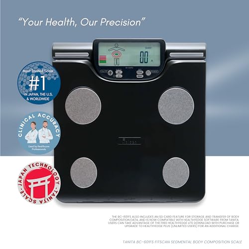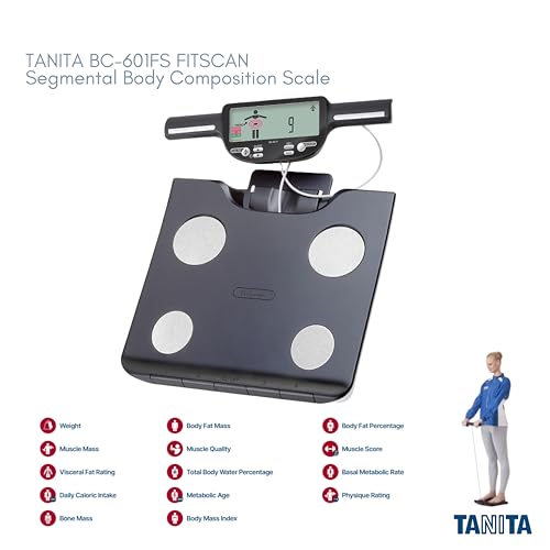 El FitScan BC-601FS es la herramienta perfecta para controlar la eficacia de cualquier programa de acondicionamiento físico o de salud. Con la tecnología de análisis de impedancia bioeléctrica (BIA) exclusiva de Tanita, este monitor de composición corporal de 8 electrodos muestra 19 lecturas: 9 de todo el cuerpo y 10 segmentarias (brazos, piernas y zona del tronco) para que puedas ver exactamente cómo responde tu cuerpo a cambios específicos de entrenamiento y estilo de vida. Desde el seguimiento de las tendencias de la grasa corporal y la masa muscular hasta la recomendación de calorías y la indicación de los niveles de hidratación, este monitor le ayuda a adaptar sus necesidades dietéticas y de ejercicio para alcanzar sus objetivos. Hasta 4 usuarios pueden registrar y revisar sus resultados, que se almacenan durante 6 meses. Los 8 electrodos BIA permiten que el BC-601FS supere con creces la composición corporal estándar, lo que le permite revisar segmentalmente su composición corporal. ¿Por qué segmentar? En pocas palabras, segmental le proporciona más información que los monitores de composición corporal estándar. Este producto totalmente único proporciona lecturas individuales de la composición corporal para cada segmento del cuerpo: tronco, brazo derecho, brazo izquierdo, pierna derecha y pierna izquierda. El BC-601FS es especialmente útil para cualquier persona que esté controlando el equilibrio entre los lados izquierdo y derecho del cuerpo o que esté intentando construir o rehabilitar una parte determinada del cuerpo. La pantalla LCD a color extragrande es fácil de leer y el cable retráctil garantiza que el teléfono encaje perfectamente en la unidad principal para facilitar su almacenamiento. Además, el BC-601FS incluye una función de tarjeta SD para almacenar y transferir los datos de composición corporal. Capacidad: 330 libras/150 kg, incremento de 0,2 libras/0,1 kg, frecuencia única. Medidas de todo el cuerpo: peso, IMC, porcentaje de grasa corporal, masa muscular, porcentaje de agua corporal, ingesta calórica diaria, edad metabólica de 12 a 90 años, masa ósea, índice de grasa visceral. Medidas segmentarias:% de grasa corporal, masa muscular, memoria para 4 personas, modo atleta, modo invitado