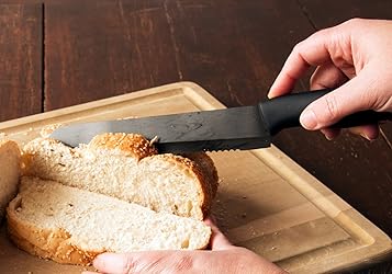 FORGET ABOUT SHARPENING WITH THIS CERAMIC KNIFE. The advanced 8" ceramic blade of this bread and vegetable knife holds its exceptionally sharp edge more than ten times longer than stainless or carbon steel cutlery. Unlike stainless steel, ceramic knives don't ever react with foods, and never rust. The razor sharp edge means that you can use it as a bread scoring knife in place of a lame when you are baking bread. CUT PAPER THIN SLICES IN SECONDS. This bread slicer cuts through melons, tomatoes, crusty bread, meat , and cheese. Its serrated blade makes it the perfect tomato slicer as it cuts through the thin, slippery skins of tomatoes and other fruits and vegetables without crushing the interior. It will not only be your go to bread knife, but your most frequently used cheese knife, pizza knife, sandwich knife, and fruit knife as well. COMFORTABLE RUBBERIZED HANDLE won't slip. Chefs rave about its perfectly balanced, nonskid ergonomic grip, solid contoured handle designed for controlled use. The knife's remarkably lightweight, ergonomic design reduces fatigue during repetitive cutting chores. The large ceramic knife blade means you will be able to use this for many everyday kitchen tasks. EASY CARE Single piece satin finish polypropylene handle has no seams to harbor germs or bacteria; top rack dishwasher safe for easy cleaning. The knife sheath is custom molded to keep the blade safe in a drawer. The cover also keeps your fingers safe when reaching for the knife. LIFETIME REPLACEMENT WARRANTY: Return for replacement at any time, for any reason, no questions asked