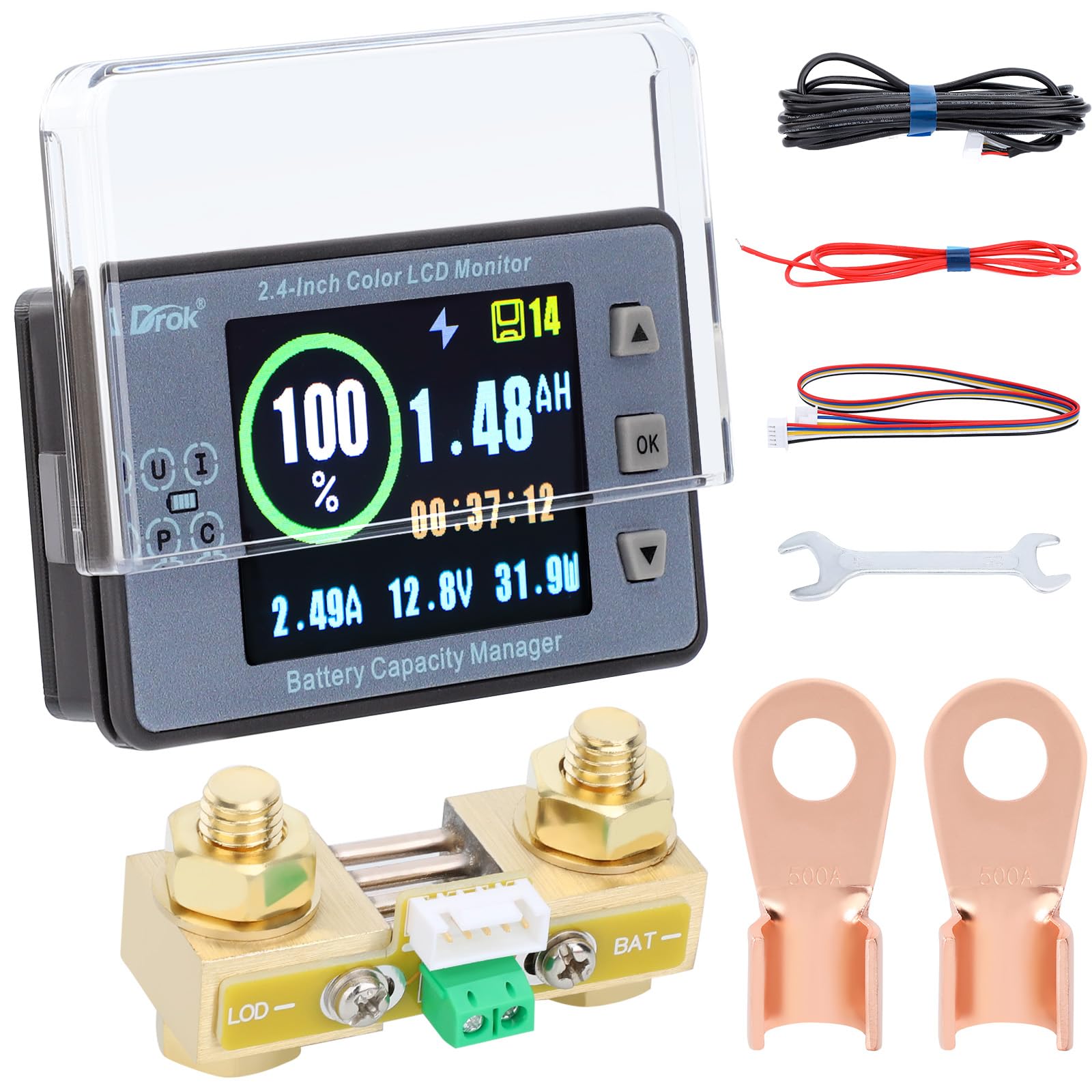 DROK Digital Multimeter DC 6.5-100V 20A Voltage Amperage Power Energy Meter, DC Volt Amp Tester Gauge Monitor LCD Digital Display with Built-in Shunt