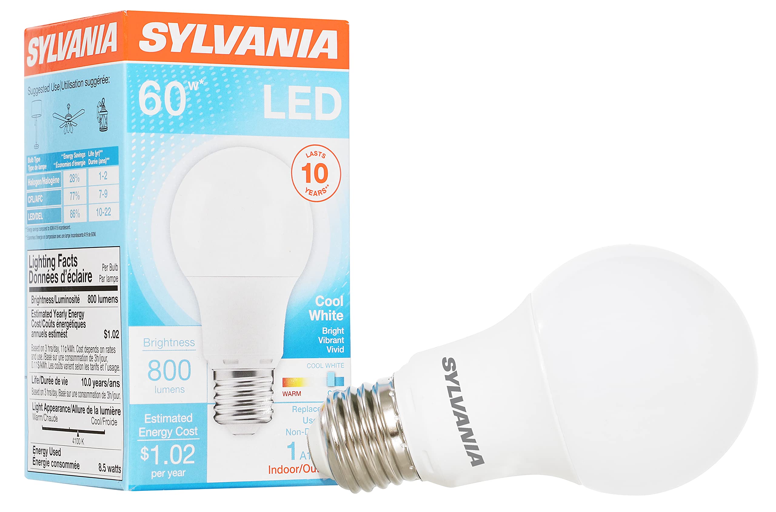 - Reduces energy consumption up to 85% over incandescent bulbs and lasts up to 10 years Save up to $41.14 over life of lamp
