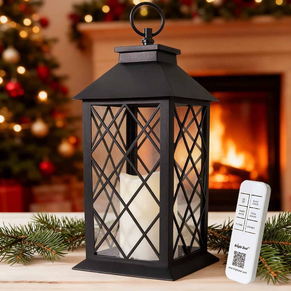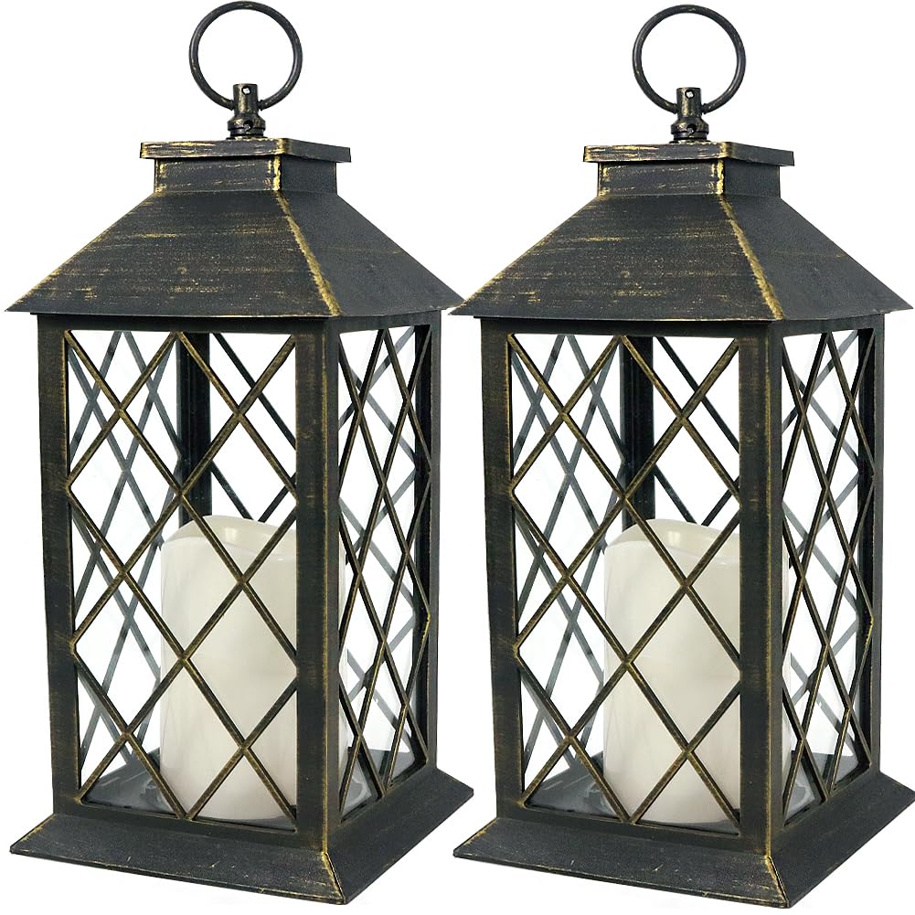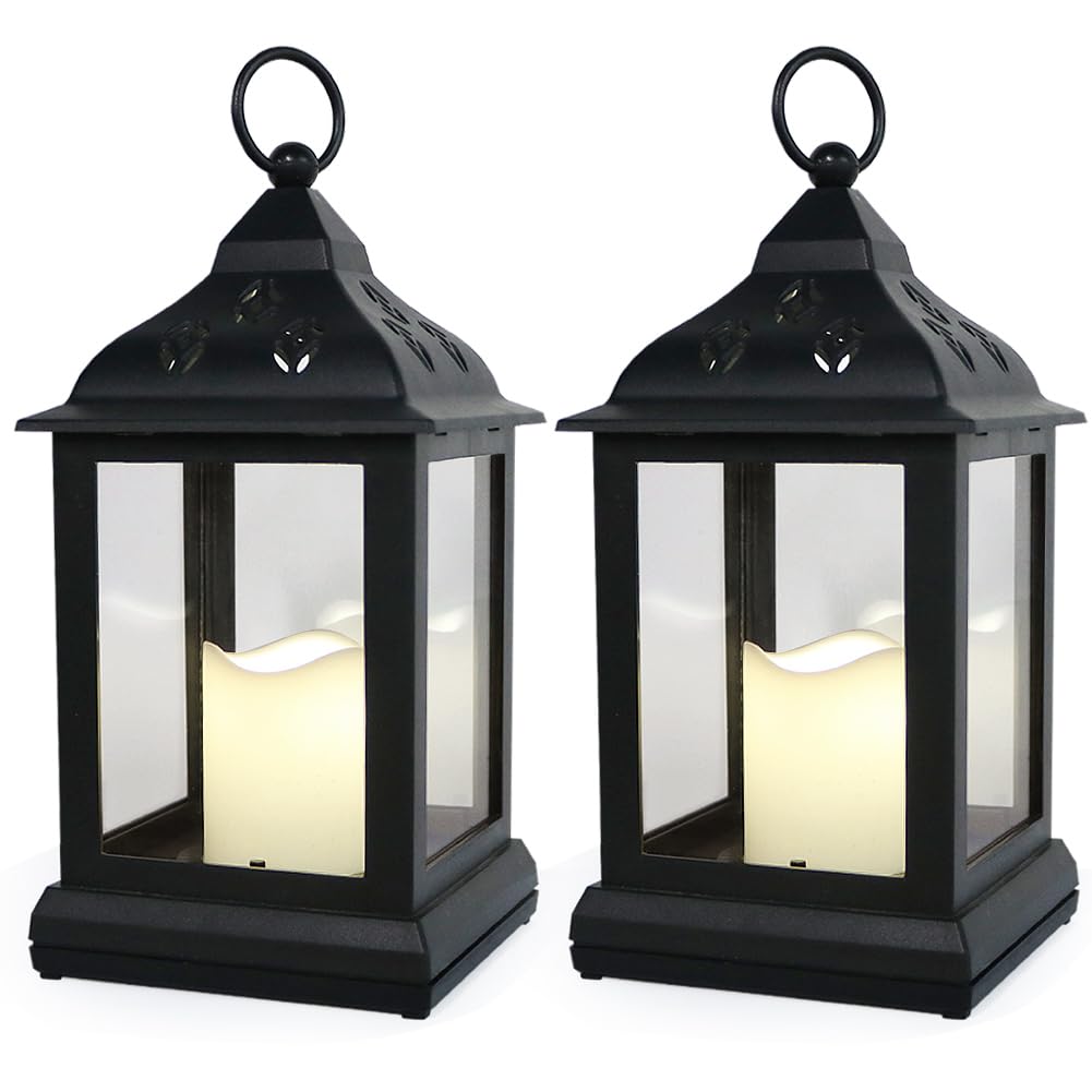 Bright Zeal 2-Pack 13.5" Vintage Candle Lantern with LED Pillar Candle (Black, 6hr Timer) - IP44 Waterproof Battery Powered Decorative Light - Outdoor Patio Hanging Lantern Decorative Tabletop Light