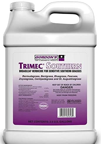 Lawn Weed Killer with TRIMEC For use on 9 turf types Controls a wide range of lawn weeds A patented combination of 3 proven weed killers Directions for use in conventional & hose end sprayers CONTAINS: 5.30% Mecoprop, 3.05% 2,4-D, 1.29% Dicamba. USE ON: Bermuda, Bahia, Blue grass, fescues, rye, Centipede, St. Augustine and Zoysiagrass. (Note: Not for use on improved varieties in the South). CONTROLS: Most broadleaf weeds. RATE: 1 – 1.5 oz. per gallon to 400 sq. ft. for southern grasses. 1 .5 oz. per gallon to 400 sq. ft. for Northern Grasses. APPLICATION: Apply as a uniform spray with a fan nozzle on turf or follow the labeled directions for using a hose end sprayer. CAUTION: Avoid spray drift on shrubs & trees. Spray to accurately obtain indicated coverage.