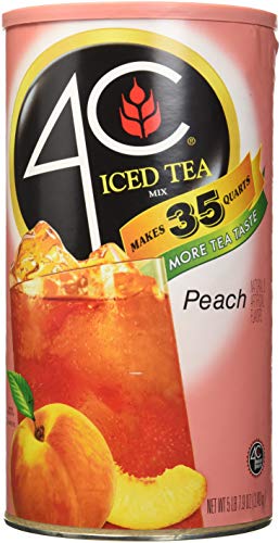 Have the refreshing, peachy taste all year long with of 4C Peach Iced Tea Mix. A delicious blend of black tea, real sugar, and peach flavor. Makes 35 quarts and is packed in an easy-open canister complete with a measuring scoop.