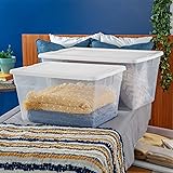 Dimensions & Size: The storage boxes have outside dimensions of 29 3/4" x 18 3/4" x 13 1/2" and interior dimensions at the bottom of 24 1/2" x 13 3/4" x 12 3/4", making them ideal for organizing items. Versatile & Convenient: The storage boxes are ideal for a variety of basic and lightweight storage needs, making them perfect for use throughout the home. Secure & Easy Handling: The opaque lid securely snaps onto the base, providing a firm grip for effortless lifting and carrying. Easy Visibility: The clear base of the container allows for effortless viewing and locating of contents. Sterilite products are proudly made in the USA since 1939 and are BPA and phthalate-free.