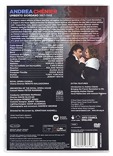 Giordano: Andrea Chenier - Blu-ray - "Kaufmann is performing the title role for the first time, and it's hard to imagine him bettered. His striking looks make him very much the Romantic and romanticised outsider of Giordano's vision. His voice, with it's dark, liquid tone, soars through the music with refined ease and intensity: all those grand declarations of passion, whether political or erotic, hit home with terrific immediacy." - The Guardian Presented in it's Covent Garden premiere in January 2015, this staging - directed by David McVicar and conducted by the Royal Opera's Music Director, Sir Antonio Pappano - shows a bloody tricolour daubed with the words "Even Plato banned poets from his Republic" - written by Robespierre on the death warrant of the historical Chénier, a poet and journalist sent to the guillotine in 1794 for criticising France's post-revolutionary government. Andrea Chénier was a great success at it's premiere at La Scala, Milan, on 28 March 1896. It established Giordano as a leading member of Italy's giovane scuola, and has remained Giordano's most popular opera, with occasional productions at leading opera houses. This production is the first by The Royal Opera since 1984. Of Giordano's later operas, only Fedora (1898) has attracted some continued interest.