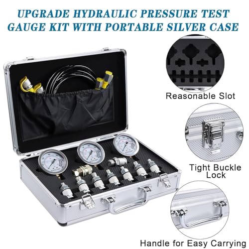 - Diseño Todo en Uno y Conveniente: 3x Mangueras de Prueba, 9x Acoplamientos de Prueba, 3x Medidores Hidráulicos de Prueba, 1x Caja de Almacenamiento Portátil de Aluminio. Todas las piezas del kit están colocadas en la caja con un diseño de empaque compacto que ahorra espacio de almacenamiento y es fácil de transportar.