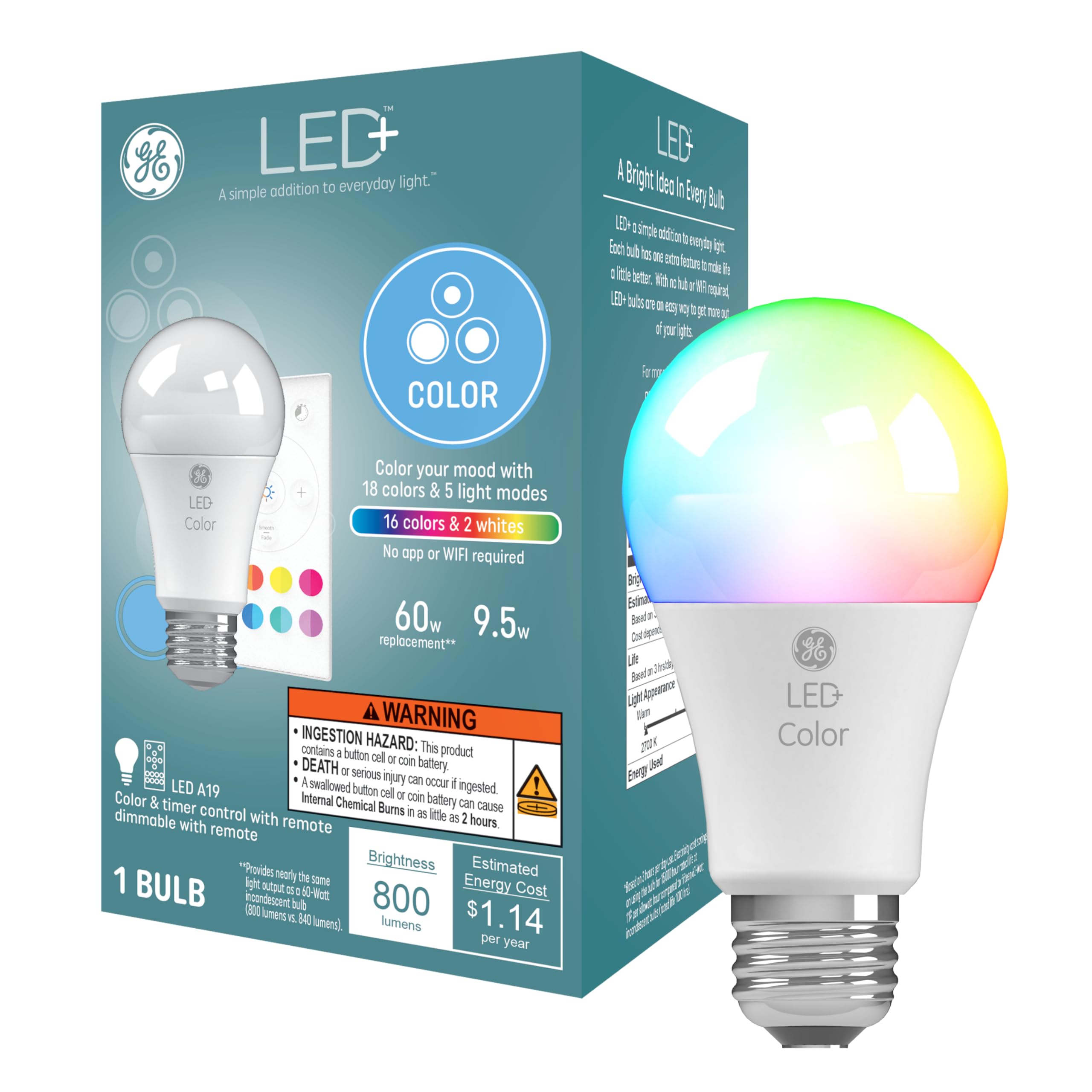 This is a 5W LED color changing light bulb with remote control of improved edition, with 45 degree beam angle, color is uniform. No obvious color splitting. (1) Warm White. 2700K , CRI>80 , Equivalent to 40W incandescent in 100% white light. (2) Color changing. 12 color choices by remote controller. (3) Dimmable Dimmable by remote controller, the lowest brightness can be up to the effect of night light. (4)Smooth and Flash: Smooth mode: color tone is much softer. This makes home environment comfortable. Flash mode: a dynamic jump mode. There are 5 kinds of speed option. And the system has sync and memory function. It is good for mood lighting and decorative lighting. Timer function: (1) You can set how many hours to turn off the lights. (2) You can also set the daily automatic turn-on and turn-off time. Memory function: YES Sync function :YES Wattage: 5W Input voltage: 85-265V Universal Color temperature : 2700K Brightness: 400 LM (Warm White) CRI: >85 Light color: RGB multi color Beam angle: 45 degree Includes: E26 LED light bulbs * 6 Remote controller * 2 User Manual * 1