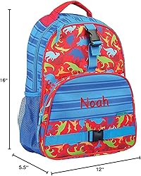 PLEASE NOTE: Includes personalization. No special/foreign characters please. Only the first letter will be in caps. Measures approx. 16'' x 12'' x 5.5'' Mesh pockets on both sides Inside pocket. ID tag printed on inside. Fully lined main compartment. Cushioned adjustable shoulder straps. Ages 3+