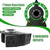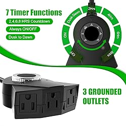 Automatic Light Sensitivity: This lamp timer comes with a photocell light sensor, which will automatically turn on at dusk and automatically turn off at dawn according to the sensor's induction, saving time of your holiday life. It is a very user-friendly light timer for outdoor christmas decorations Multifunctional and Waterproof: This is a high-quality outdoor timer plug that you can set on/off, dusk-dawn, 2, 4, 6 or 8 hours timing modes to meet your different needs.The timer function is only available at dusk, meaning the timer will automatically set to turn off 2, 4, 6, or 8 hours after the light sensor is triggered.(Please switch to dusk-dawn mode once before time setting). The black outdoor timer is waterproof and available 3 sockets, which is very convenient and practical, so good for christmas decorations outdoor Quality and Safety: This electrical outlets timer is made of high-quality material and exquisite craftsmanship, which is eco-friendly and durable. It is UL certified for safe and reliable, which is more secure and durable than similar product Energy Saving and Wide Application: The electric timer comes with a light-sensitive smart switch that is very energy efficient, which is widely compatible with outdoor lights, garden lights, rope lights, fans, swimming pool lights, small outdoor fountains, pool pump,etc., It is a great household item for outdoor christmas decorations yard 3 exit outdoor lighting timer: Three exit timer can simultaneously control Christmas lights and outdoor pool pumps,and for the use of other electrical equipment. It really is perfect for outdoor christmas decor