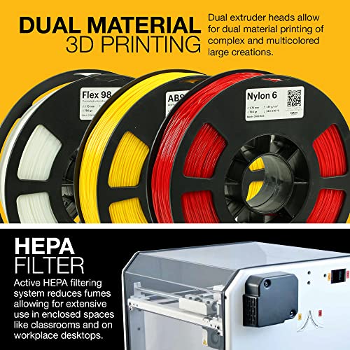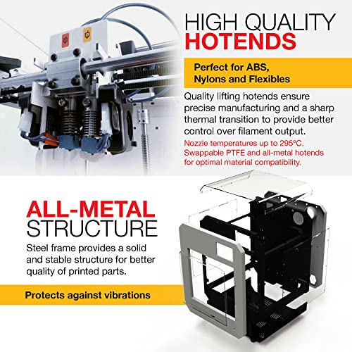 - Dual extrusion with lifting nozzles: print almost any geometry with accuracy and reliability