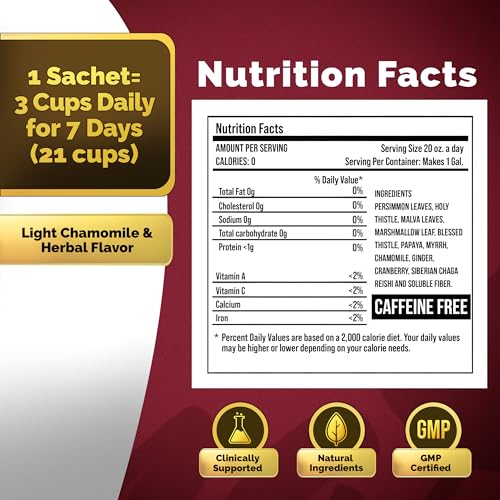 - Ingredients: It is a blend of 12 herbs and contains Persimmon Leaves, Holy Thistle Malva Leaves, Marsh, Blessed Thistle, Papaya, Myrrh, Chamomile, Cranberry, Siberian Chaga, Ganoderma Lucidum, Soluble Fiber, Ginger.