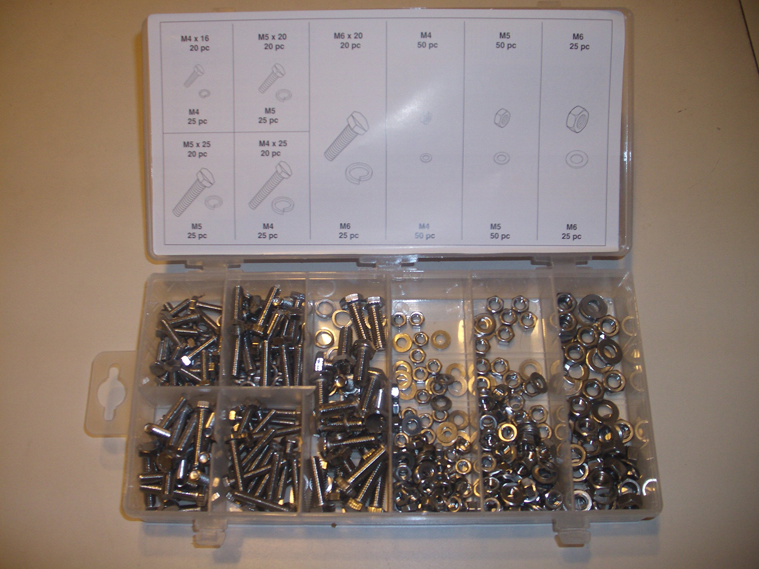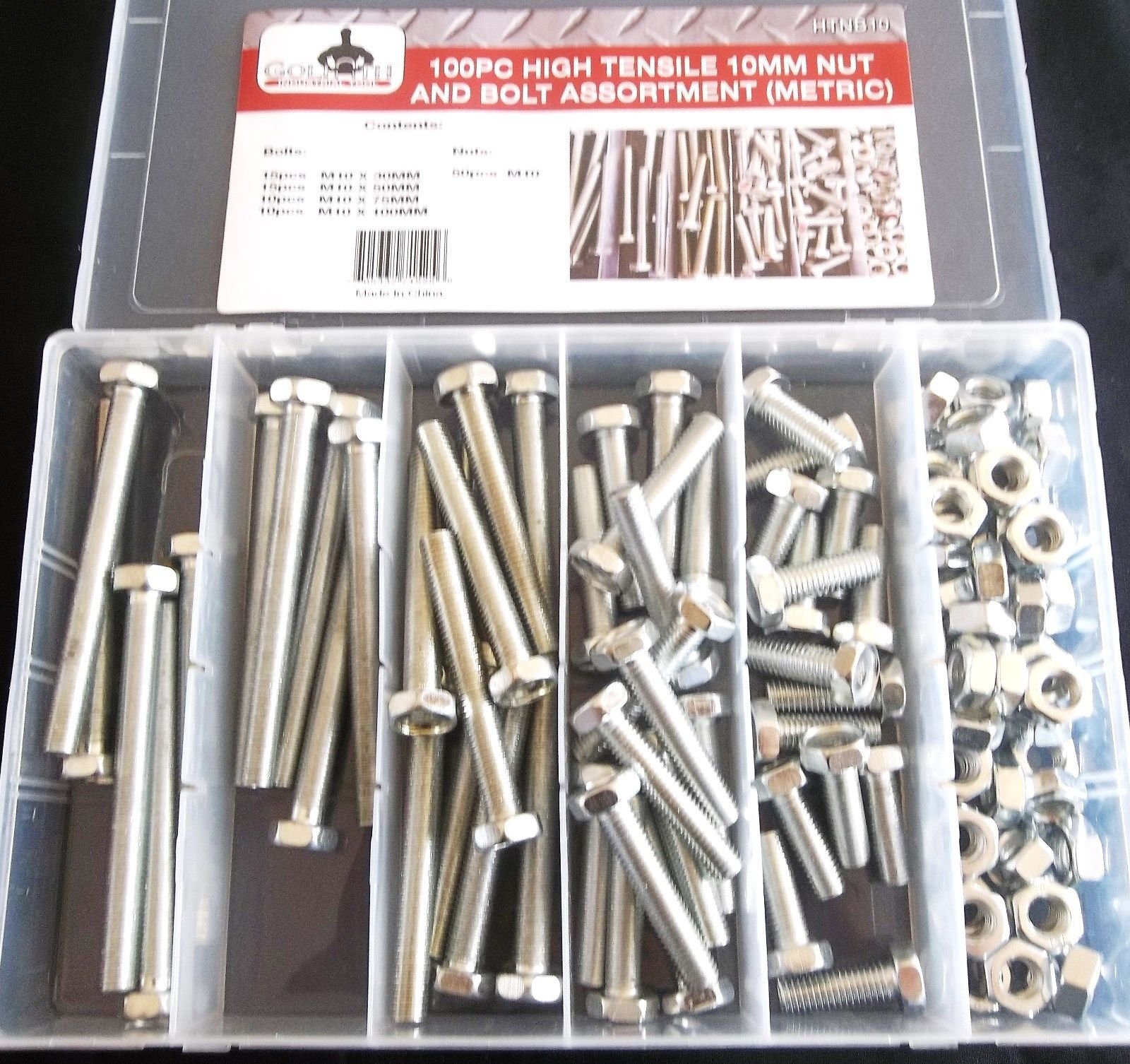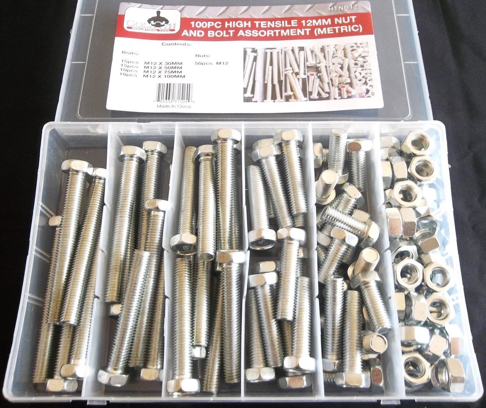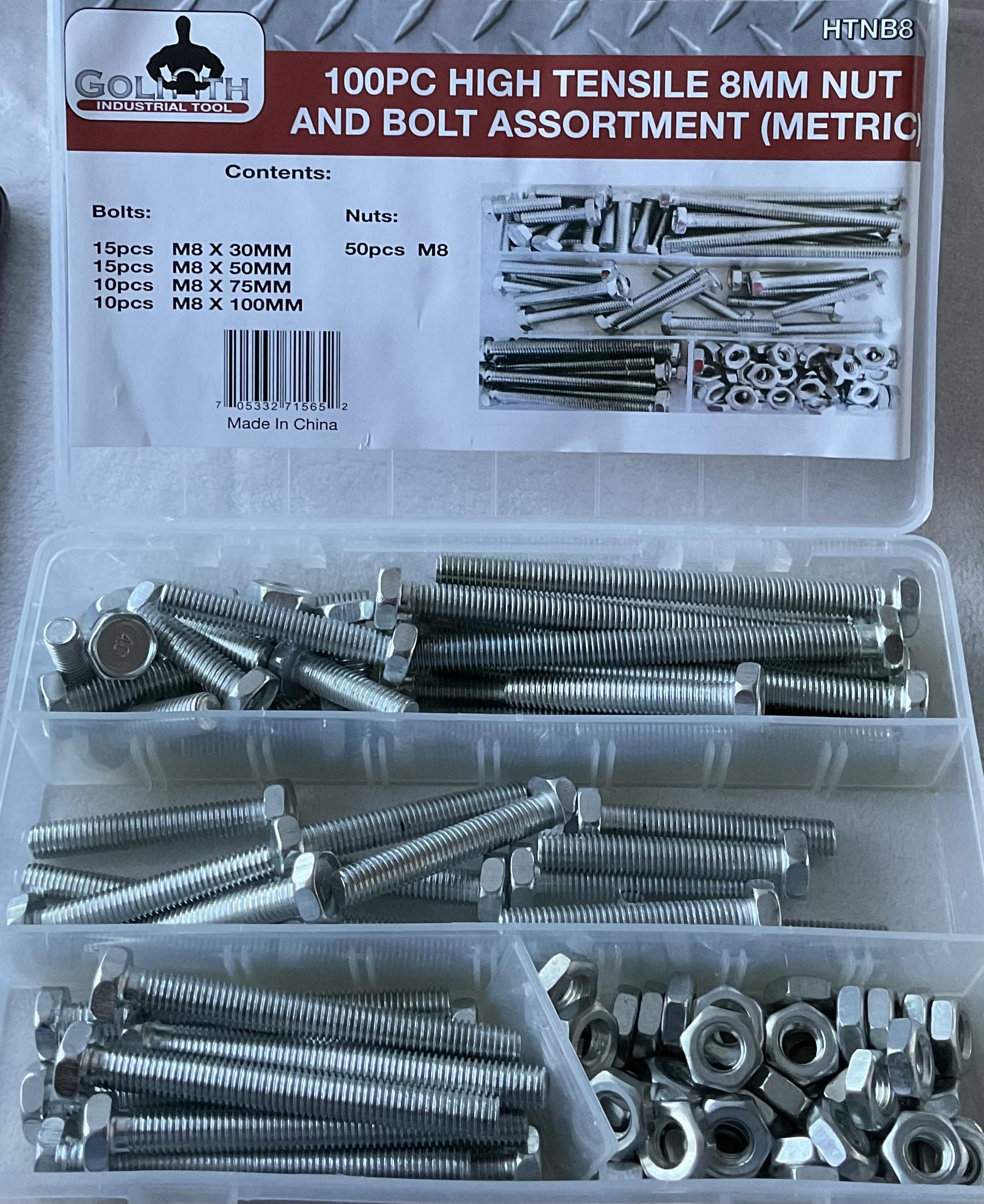 100pc High Tensile Nut And Bolt Assortment Set Contents: Bolts: 15pcs M8 X 30MM 15pcs M8 X 50MM 10pcs M8 X 75MM 10pcs M8 X 100MM Nuts: 50pcs M8