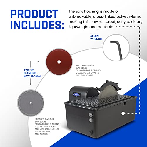 - COMPLETE SAW: Our rock saw for cutting rocks includes everything you need to complete your slabbing projects. This kit features hobby tools like a 10" notched diamond stone cutter saw blade, a 10" sintered diamond rock cutter cabbing machine glass cutting saw blade, spray shield, Allen wrench, waterproof apron, and a full written and visual instruction manual. Simply add water, plug into an electrical outlet, and start slabbing with this wet saw for stone cutting and wetsaw for rocks today!