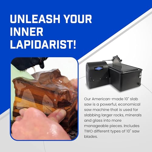 - SMART SLABBING MACHINE: Our powerful 10" flat lapidary machine is a rock trim saw for slabbing larger rocks, minerals, and glass into more manageable pieces. It comes with TWO 10-inch lapidary saw blades. Designed for slabbing large rocks & minerals like agates, jades, thundereggs, and geodes, including a sintered diamond saw blade for cutting large pieces of glass, topaz, quartz, and fine agates. This rock saw for cutting rocks and rock cutting saw can cut & slab up to 4" in height of material!