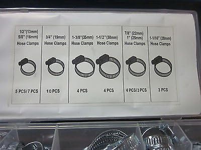 40pc Steel Hose Clamp AssortmentGOLIATH INDUSTRIAL TOOL Sizes Include:5pcs 1/2 (13mm)7pcs 5/8 (16mm)10pcs 3/4 (19mm)4pcs 7/8 (22mm)3pcs 1 (25mm)3pcs 1-1/16 (28mm)4pcs 1-3/8 (35mm)4pcs 1-1/2 (38mm)Exported By ExportYourStore