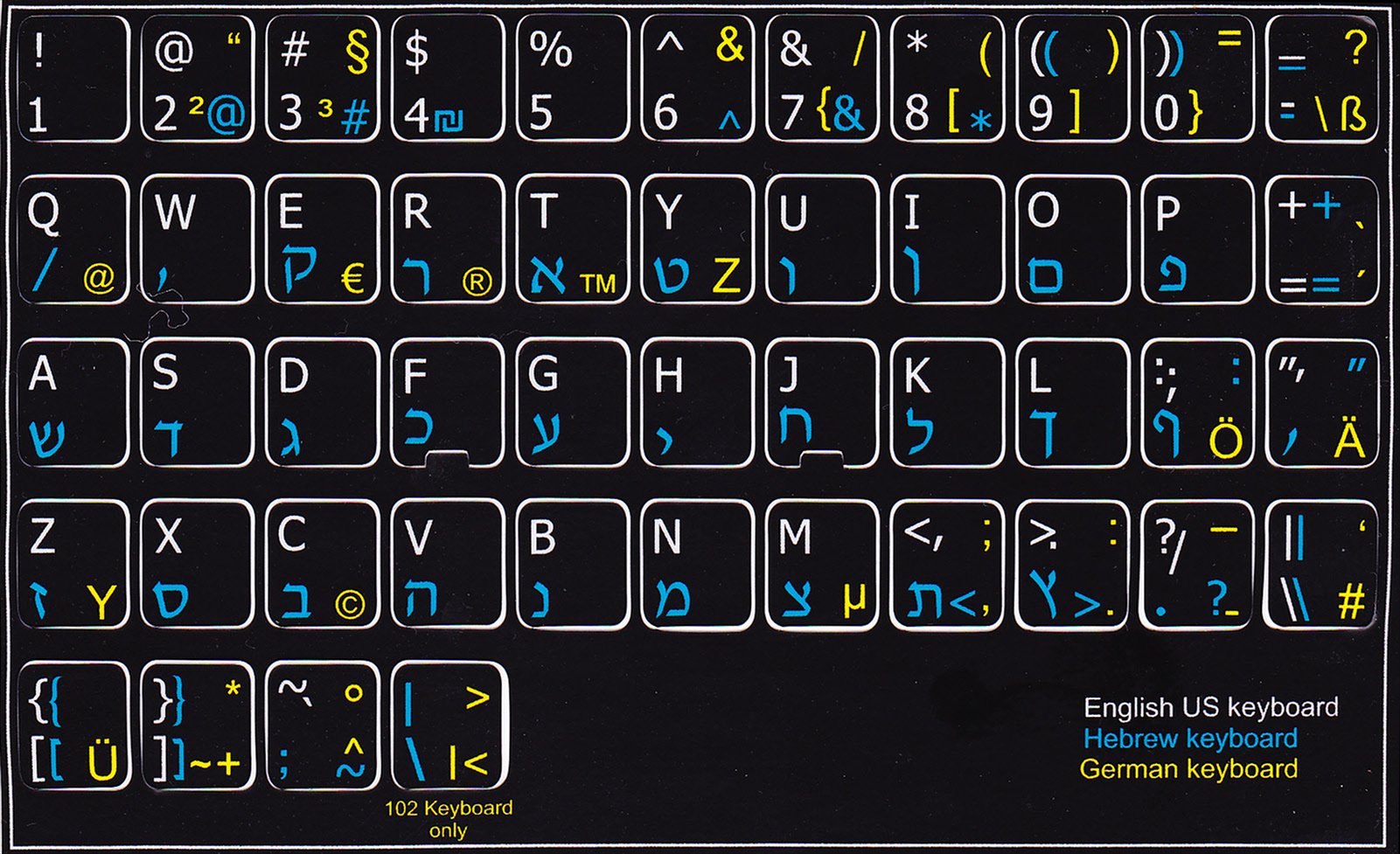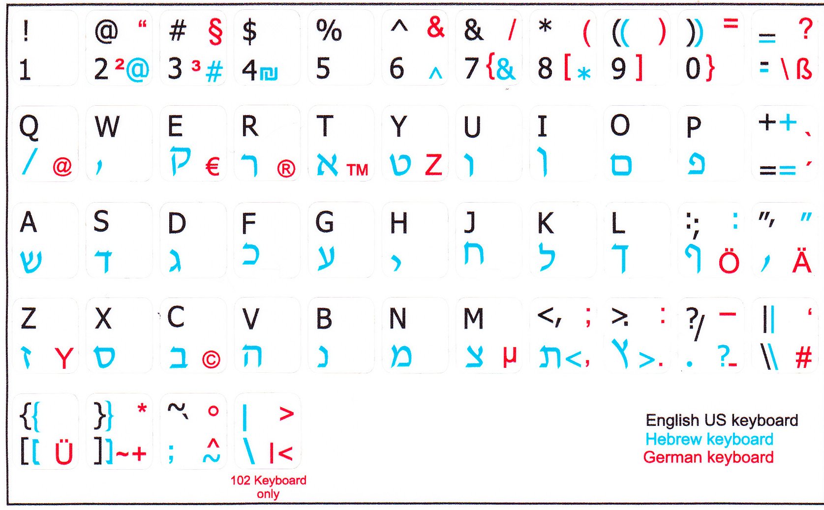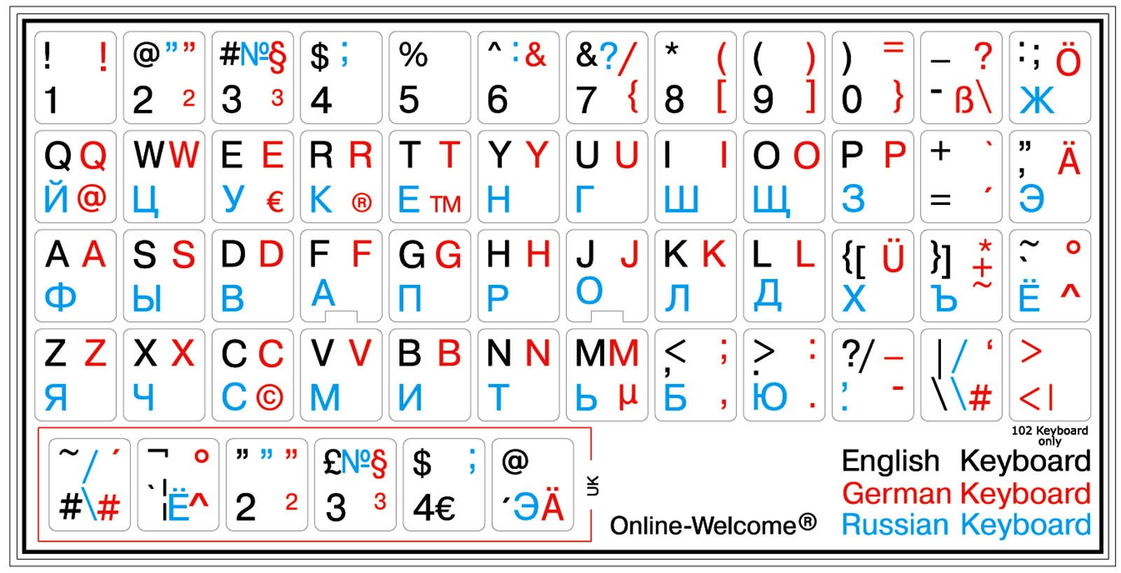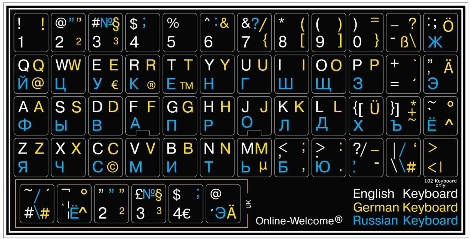German - English keyboard stickers non transparent background for any laptop computer pc desktop notebook are made with typographical method on high-quality Matt Vinyl, thickness - 80mkn. You can use Keyboard Stickers on different keyboards on Desktops, Laptops and Notebooks with Windows.Stickers has been manufactured and distributed by Eurmart Online-Welcome LLC , Trade Mark Online-Welcome . You can use our pictures and description with our permission only.