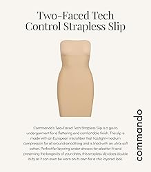 - Transform any form-fitting ensemble with the Commando Two-Faced Tech Control Strapless Slip, a sophisticated base-layer solution that combines comfort with seamless shaping. Engineered with Commando’s breakthrough Two-Faced Tech fabric—microfiber on the outside for a sleek finish, soft cotton inside for comfort—this strapless slip offers light-to-moderate compression that smooths the tummy, waist, hips, and back without feeling constrictive. Designed to stay perfectly in place, this strapless shapewear earned top marks as InStyle’s Best Overall Slip thanks to its flawless fit that “didn’t shift or roll down” and felt “completely invisible under clothing.” InStyle With raw-cut edges that deliver a seamless silhouette and four-way stretch plus high recovery, it molds to your body and dries quickly—perfect for special-occasion styling or daily wear. Fit-tested by real women and crafted for modern convenience, it’s proudly made in the USA with quality and elegance. Clinch a flawless figure in wedding gowns, strapless minis, or slim suiting—without compromising comfort or polish. Commando has revolutionized the way women experience undergarments and clothing. Founded on the principles of comfort, quality, and confidence, Commando uses innovative fabrics and meticulous design to create pieces that make you feel your best. Our signature raw-cut edges ensure invisible support, while our commitment to premium materials like European microfiber guarantees exceptional longevity. From Commando underwear and bras to slips and shapewear, each piece is designed to fit flawlessly and provide lasting comfort. Many of our products are machine washable and tumble dry friendly, so caring for them is simple. Just double-check the care label on your item for guidance. Discover the Commando difference and experience a wardrobe that inspires confidence.