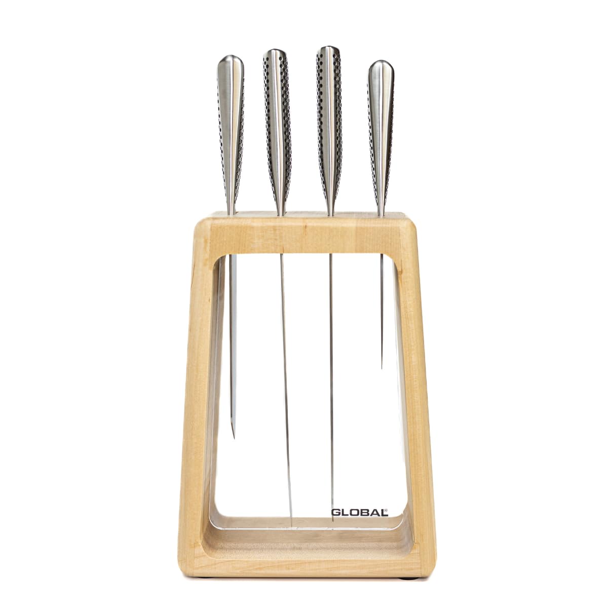Global Ukon 6 Piece Knife Block Set - 8 inch Chef, 9 inch Bread, 7 inch Santoku, 6 inch Serrated, 3 1/2 inch Paring, Knife Block, Lightweight Japanese Steel, Razor Sharp Edge, Made In Japan, GU-6001