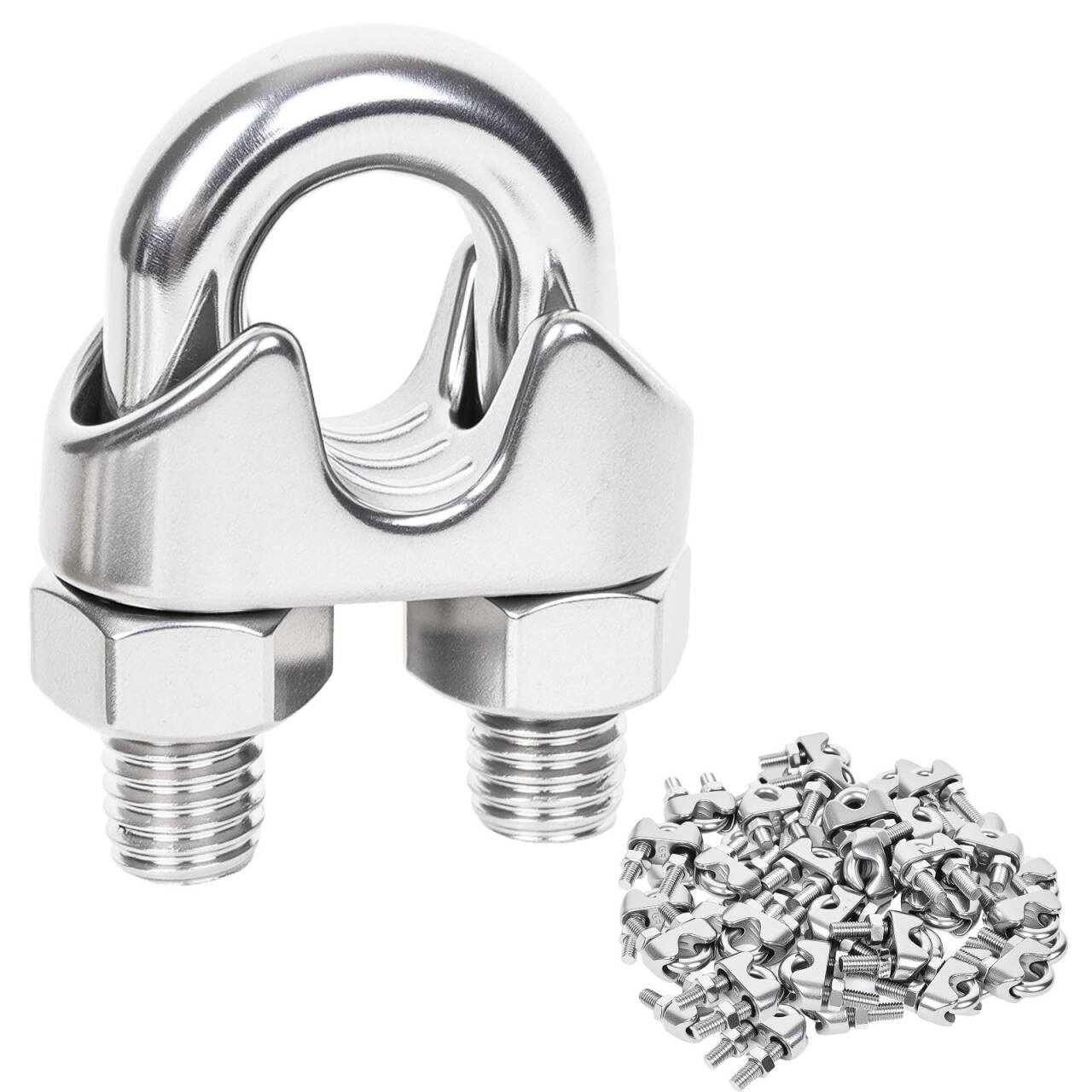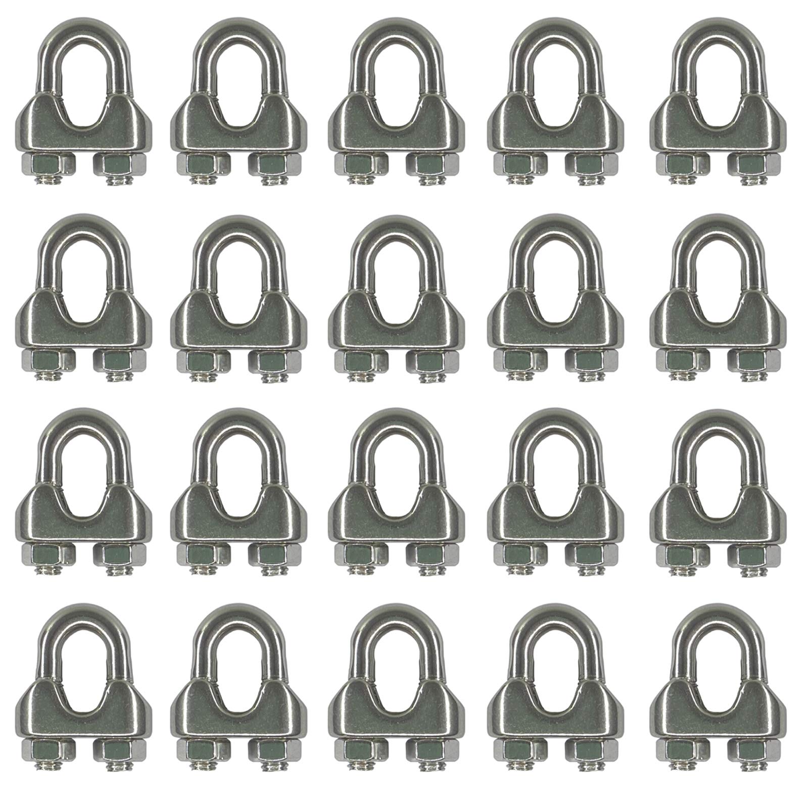Essential hardware item for heavy duty rigging rope, wire and cable. Precision casting, smooth surface. Package includes: 20 pieces wire rope cable clamps Note: Wire rope should the same diameter as rope clip. Head restraints should suitable for the thickness of the wire rope, u shaped inside of the ring spacing, larger than steel wire rope diameter 1 - 3 mm, distance too large do not clamp the rope. When in use, make u bolts tightened, until about 1/3 up the rope was crushed, due to rope in force after deformation, after the rope shengka force to conduct second tightened to ensure reliable joints.
