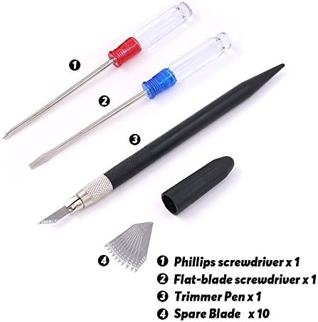 - ✔ DURABLE: Trimmer pen is tightly clamped and has high hardness, plastic handle, and anti-skid design. With safety protection cap to protect blade. The cutting pliers is made of carbon steels, good durability. The tweezers are made of high strength stainless steel, anti-static, anti-acid, anti-corrosion and anti-magnetic. Other items also have high quality.