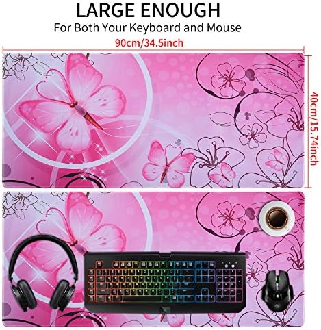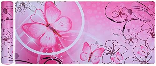 Alfombrilla de ratón de juego grande XXL Extendida Alfombrilla de escritorio completa Alfombrilla de ratón linda con superficie impermeable Superficie de juego optimizada, base de goma antideslizante Borde cosido Alfombrilla de ratón (35"x15.55"x0.08")-Mariposa rosa