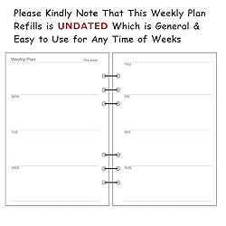 ♥Refillable and standard a5 refills, suitable for a5 6-rings binder(paper size:8.26 x 5.59''=21x14.2 cm), easy to carry with. not for any 2 rings, 3 rings or 7 rings bidners. ♥45 Sheets(=90 pages)/set, double sided printed, made of 100g qualified thickness paper, writing smoothly and fit for most ink (no smearing)in market. Its creamy color is good for eyes. ♥Simple design, neatly cutting, standard 6-rings rule lined paper, can be easily take out and in. Each sheet is 1 week, start with Monday and when open like a book, Monday on left. ♥A gift that works well for all who have received it! You can write down what's going on and what to do on day basis, make your life more productive. ♥Attention Please: Please mind size in the dimension image before purchasing. And any problems, please feel free to let us know, we’ll be at your service with heart and soul.