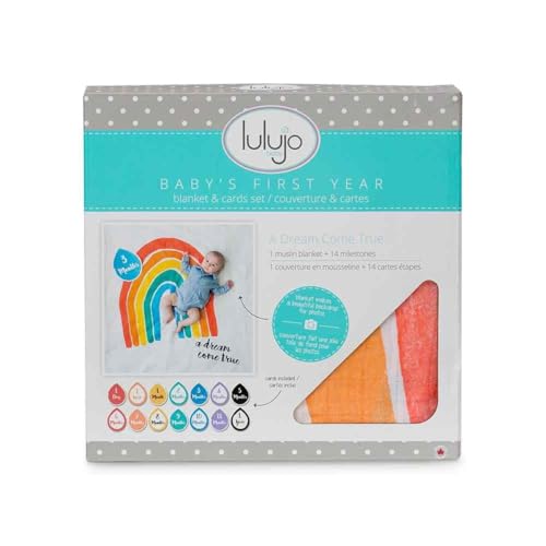 Keep track of baby's growth while creating keepsakes along the way. This muslin blanket and card combination makes the perfect prop for baby's milestone photos. Spread blanket as a beautiful backdrop, place baby down on the soft 100% cotton muslin, choose one of the 14 coordinating milestone cards showing baby's age from 1 day to 1 year, and snap away. Take photos tracking baby's growth to share on social media, and to save as treasures for years to come. The 40 x 40-inch muslin blanket is prewashed cotton and gets softer with each wash. Blanket that can also be used as a saddler, stroller cover, baby blanket, and nursing cover. This is the ideal baby shower gift. Beautifully packaged set gets parents ready to create memories right from the beginning- day 1. Lulujo is a proudly Canadian company behind premium baby essentials. An ever growing global business, our brand is simple: create functional products with comforting fabrics that modern parents and babies love. Launched in 2009, the collection, known for its top-selling multi-functional cotton muslin swaddling blankets, ultra soft fabrics and fashionable fun prints, has earned its place among leading brands in the industry.