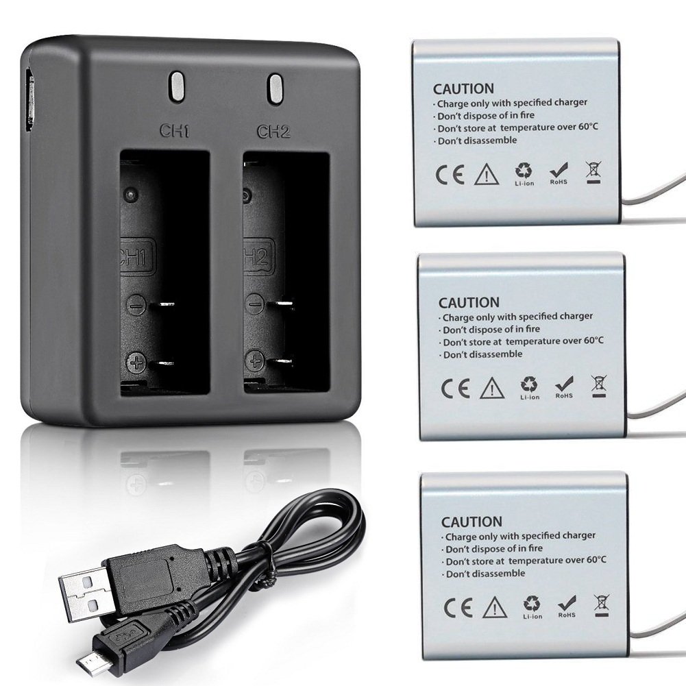 - 【Action Camera Charger Kit】 Package includes: 3 * 1050mAh Batteries + 1 * USB Dual Charger + 1 * USB Micro Cable.. (Warm Tip: Please run out of all the battery power before charging for the first time)