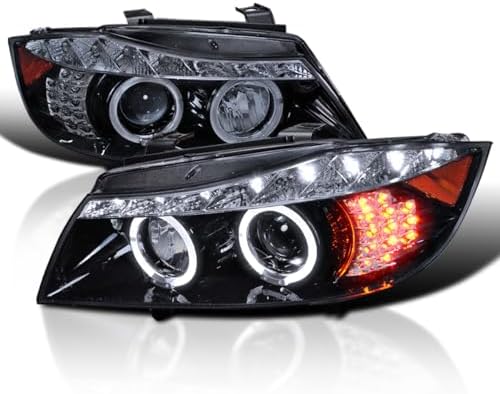 SPEC-D TUNING Halo LED Glossy Black Housing Smoke Lens Projector Headlights Compatible with 2006-2008 BMW E90 3-Series 4Dr With Stock Halogen Headlight, Left + Right Pair Headlamps Assembly