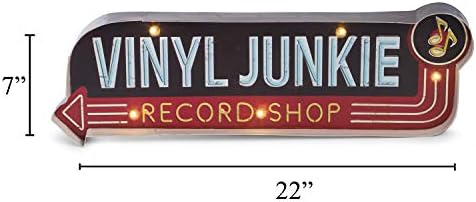 Bey Berk Vinyl Junkie LED Lighted Metal Sign, Wall Décor or Free Standing Table Top Decoration for Bedroom, Living Room, Bar, Game Room, Garage, Man Cave - Battery Operated (22" L x 7" H x 2" W)
