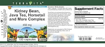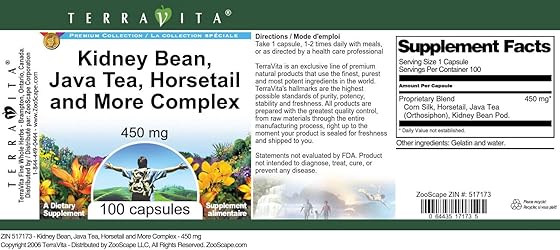 - Kidney Bean, Java Tea, Horsetail and More Complex - 450 mg (100 capsules, ZIN: 517173) Packaged in the United States in a GMP certified facility (Good Manufacturing Practice). No fillers. Manufacturer: TerraVita Size: 100 capsules Easy-to-swallow Capsules in a sealed bottle. Ingredients: Gelatin, Water, Corn Silk - 125 mg, Horsetail - 100 mg, Java Tea (Orthosiphon) - 100 mg, Kidney Bean Pod - 125 mg