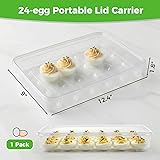 Better quality, better workmanship, better customer service. 24-GRID LARGE CAPACITY – Perfectly sized at 12.4" x 9" x 1.8", this clear container holds up to 24 eggs. Whether you are storing fresh eggs for the week or preparing a batch of deviled eggs for a party, the transparent design allows you to check your supply instantly without opening the lid. Its low profile (1.8" height) fits easily on any fridge shelf RAISED BASE FOR SHOCK PROTECTION – Thoughtfully designed with raised corner feet, these elevate the bottom of the container slightly off the surface. This creates a buffer zone that prevents the egg compartments from directly hitting hard counters or glass shelves when set down. It effectively minimizes impact shock, protecting your fragile eggs from cracking due to sudden placement SECURE SLOTS FOR FRESH & DEVILED EGGS – Keep your creations safe. The custom-shaped oval slots firmly cradle fresh eggs or slippery deviled eggs, preventing them from sliding or colliding during transport. Whether you are heading to a potluck, picnic, or BBQ, your appetizers will arrive looking pristine DUST-PROOF LID & STACKABLE DESIGN – Maximize your space. The included snap-on lid keeps dust out and locks freshness in, ensuring your food stays clean. The flat top design allows you to stack other items or additional egg boxes on top, making efficient use of vertical refrigerator space VERSATILE STORAGE – The independent compartments are perfect for isolating similarly shaped fragile foods like strawberries and dumplings. This design keeps soft fruits and pastries neatly organized, preventing them from sticking together or getting crushed by heavier items