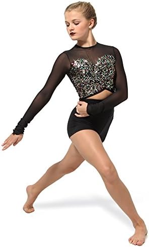 A stunning multi-hued sequined crop top boasts front and back mesh panels with a gathered center front, forming a sweetheart neckline. The mid-length body and inverted hem create a slimming effect. Features full front lining. Made from Polyester, Spandex, and Powerstretch Mesh.