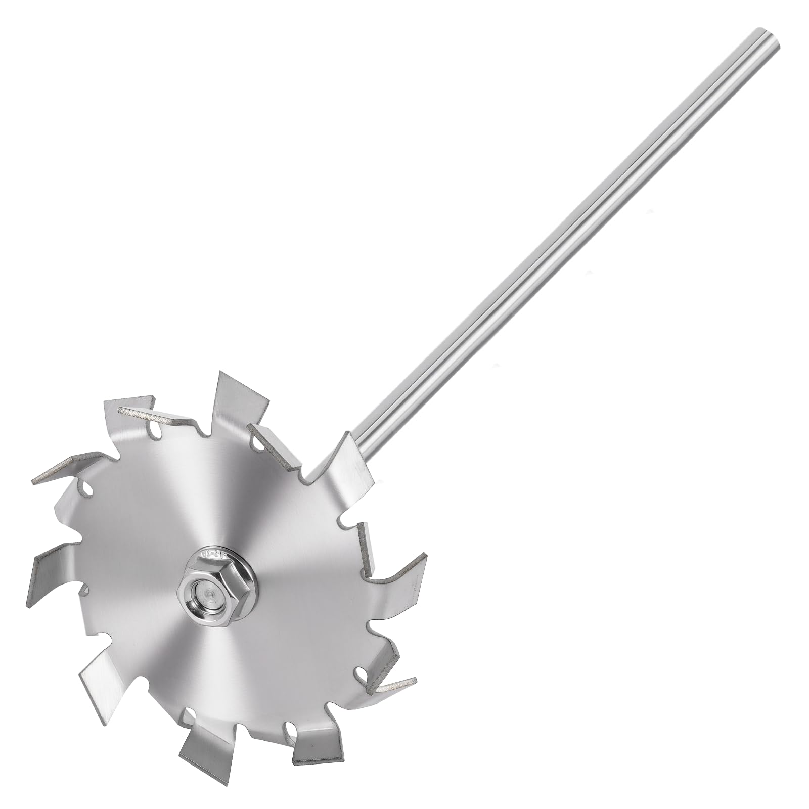 Working Principle: The dispersing disk is an accessory supporting the high-speed disperser, connected to the main shaft of the high-speed disperser. When the main shaft of the disperser rotates at high speed, the upper and lower parts of the disc rotate, generating strong shear force through high-speed rotation, and forming turbulence area at the edge of 2.5-5MM, so that the materials can be fully refined and evenly mixed. The upper and lower teeth of the dispersing disk carry out high-speed shearing, impact, crushing and dispersing of materials such as paint, lacquer, dry powder, solid and liquid, in order to achieve the state of dissolution, dispersion and refinement, so as to achieve the effect of rapid mixing, dissolution and dispersing. Characteristic: 1. Efficient crushing and dispersion: During high-speed operation, the dispersion disk can quickly crush block shaped or agglomerated materials into small particles or droplets, making the material particle size distribution more uniform. 2. Good emulsification effect: The shear and impact forces generated by its high-speed rotation can fully mix and emulsify the oil and water phases, forming a stable emulsion structure suitable for various media ranging from low viscosity to high viscosity. 3. Improve flow characteristics: The edge of the dispersion disk can form a turbulent zone, promoting axial and radial flow of materials, forming a good circulation, and improving the mixing and dispersion efficiency of materials. 4. High strength and durability: With high strength and hardness, it is not easily deformed or damaged during long-term high-speed rotation and continuous friction with materials, and has a long service life. 5. Good dynamic balancing performance: After undergoing dynamic balancing tests, it can maintain stability during high-speed operation, reduce vibration and noise, minimize the impact on equipment and production environment, and improve production stability and reliability. 6. Easy to clean and maintain: The surface is smooth, the material is not easy to adhere, and cleaning is convenient and fast, which can effectively avoid material residue affecting product quality. The cleaning process is simple and easy to maintain hygiene. 7. Simple and practical structure: Reasonable design, simple structure, easy installation and disassembly, easy replacement of accessories, can reduce equipment maintenance costs and downtime. 8. High temperature resistance: Able to withstand certain high temperature environments, suitable for processes that require heating or cooling. Note: 5cm disc with 7X300mm rod(1.96″disc with 0.27″X11.8″rod)