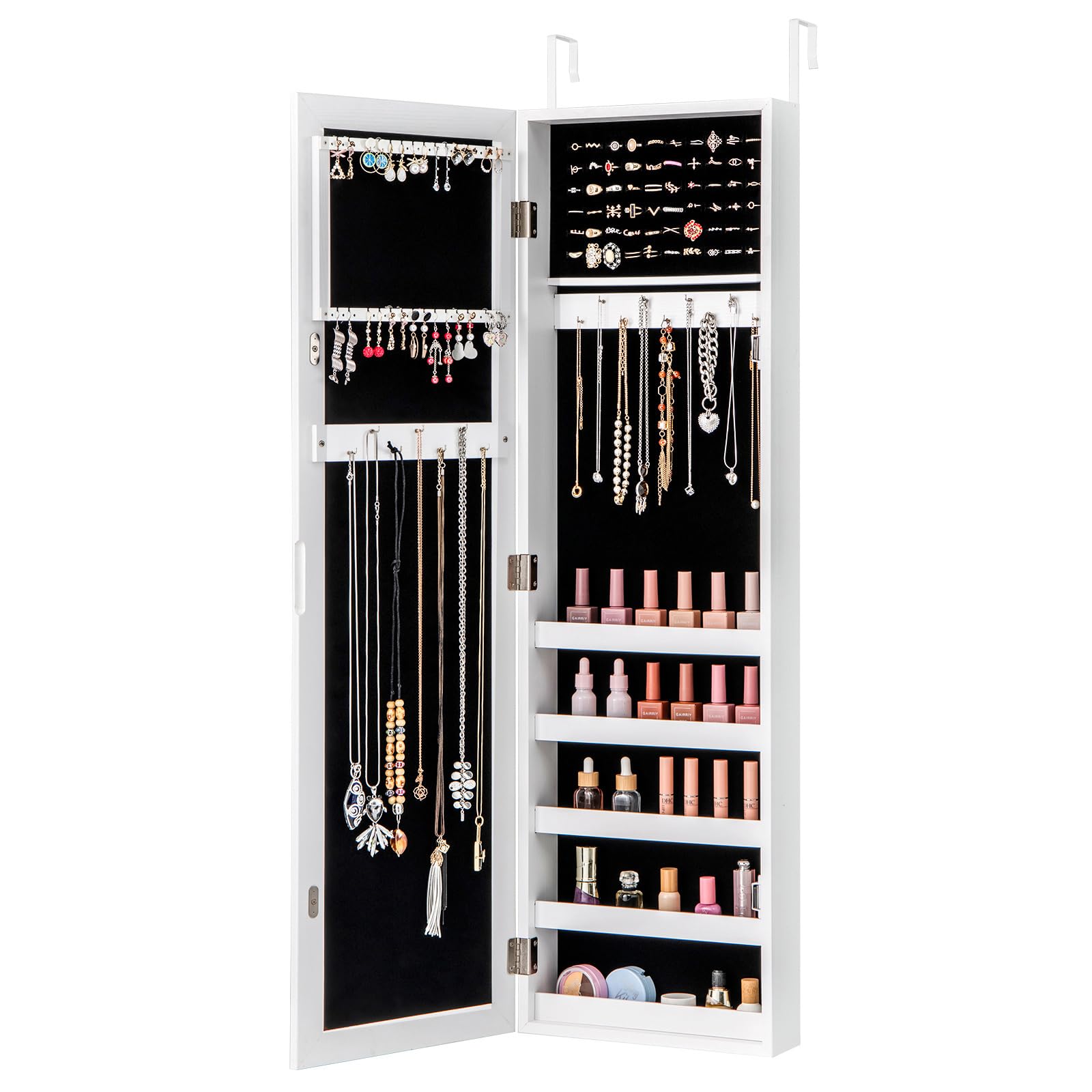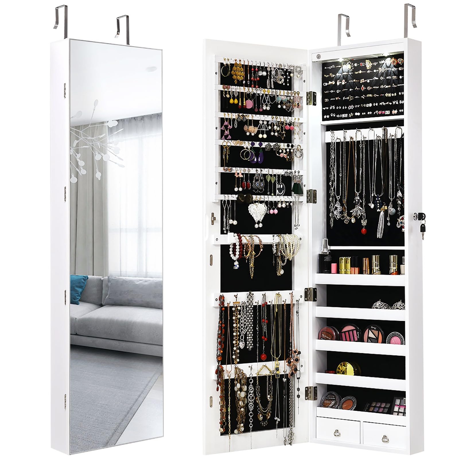 - Ample Jewelry & Accessory Storage – Keep your collection in order with 4 drawers (1 with divided slots, 1 shallow, and 2 deep) plus 2 side swing doors featuring 8 necklace hooks. Perfect for jewelry, cosmetics, skincare, and perfumes.