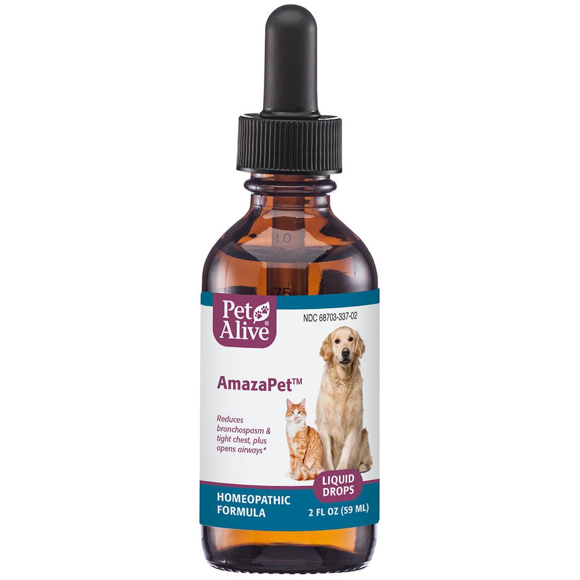 - Few things are more distressing than seeing your pet struggle to breathe through an acute coughing or wheezing episode. Everyday activities such as playing fetch outside could suddenly be too much for a dog; certain brands of litter may cause a cat to cough uncontrollably. Other symptoms of poor respiratory functioning can range from loss of appetite or weight and shortness of breath, all of which can lessen your pet’s quality of life. AmazaPet is a powerful homeopathic formulation for addressing poor respiratory functioning and promoting healthy lungs. Using a unique, proprietary blend of highly diluted and scientifically selected natural substances, AmazaPet offers an effective and safe choice for easier breathing, healthy respiratory functioning, and comfort. Symptoms of respiratory issues can present as nothing more than a dry, hacking cough, possibly progressing to wheezing sounds becoming more obvious when your pet exhales. You may notice shallow, rapid, labored breathing with marked movement of the abdomen. Your pet is trying to breathe in more air. Cats, for example, tend to extend their heads, possibly even adopting a praying position with elbows extended away from the chest. Coughing and wheezing can be triggered by allergens and stress. Some common allergens can include grass and tree pollens, fire smoke, cigarette smoke, fumes from cars and factories, dust (especially from cat litter), and aerosols of various sorts like perfumes, deodorants, and flea sprays. To ensure the safety of AmazaPet and to provide the highest quality, most effective product, all PetAlive homeopathic medicines are manufactured in a FDA-registered and cGMP-compliant pharmaceutical facility under the supervision of qualified homeopaths and responsible pharmacists. Individual ingredients are listed in the Homeopathic Pharmacopoeia of the United States (HPUS).