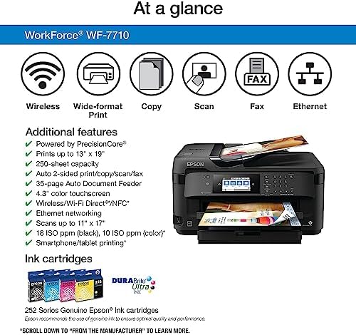 Powered by Precision Core, the workforce WF-7710 wide-format all-in-one printer quickly produces print-shop-quality borderless prints up to 13" X 19" And scans up to 11" X 17". A versatile inkjet, it features a 250-sheet tray, plus a rear feed for specialty paper, ensuring Added productivity for any office. It also includes auto 2-sided Print, copy, scan and fax, Plus a 35-page auto document feeder. Use the 4.3" Color touchscreen for easy navigation and control. Featuring the ultimate in wired and wireless networking, the WF-7710 makes it easy to print from tablets and smartphones), and includes Wi-Fi direct(2), Ethernet and NFC). This Epson printer is designed for use with only genuine Epson-brand cartridges. Other brands of ink cartridges and ink supplies are not compatible and, even if described as Compatible, may not function properly or at all. Epson provides information about the design of the printer on the box and in many other locations and materials Included with the printer and on the website. Epson periodically provides firmware updates to address issues of security, performance, minor bug fixes and ensure the printer functions as designed. This printer was designed to work only with genuine Epson ink cartridges and some updates may affect the functionality of third party ink. Non-Epson branded or Altered Epson cartridges that functioned prior to a firmware update may not continue to function. Black and color print speeds are measured in accordance with ISO/IEC 24734. Actual print times will vary based on system configuration, software, and page complexity. For more information, visit www.epsonbination/printspeed1 most features require an Internet connection to the printer, as well as an Internet- and/or email-enabled device. For a list of Epson Connect enabled printers and compatible devices and apps, visit www.epsonbination/connect2 Wi-Fi Certified; level of performance subject to the range of the router being used. Wi-Fi Direct may require printer software. 3 NFC requires use of a device that includes NFC, and may require additional software. 4 Up to 80 percent based on comparing manufacturers’ reported Tec values of the best-selling, A3 color laser printers priced at $999 (USD) or less with print Speeds of 30 ppm or less as of December 2016. Actual power savings will vary by product Model and usage. 5 see our website for convenient and reasonable recycling options at www.epsonbination/recycle6 smart way is an innovative partnership of the U. S. Environmental Protection Agency that reduces greenhouse gases and other air pollutants and improves fuel efficiency.