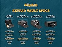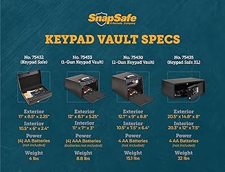 - The snap Safe keypad Vault protects handguns, electronics and other valuables with 20-gauge steel housing and foam-lined interior. The keypad allows users to program more than 12 million different access codes. Vault provides plenty of storage in a compact space and is powered by 9-volt battery (not included). Specifications: - color: Black- height: 2. 25"- length: 11"- width: 8. 5"- weight: 4 lbs. - lock type: Electronic.