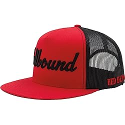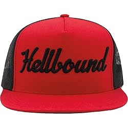 Hellbound Trucker Cap for Men – Flat Bill Mesh Snapback Hat – 5-Panel Red Cap with Bold Black Hellbound Front – One Size Adjustable – Cotton/Poly/Nylon Blend – Outdoor Summer Baseball Hat
